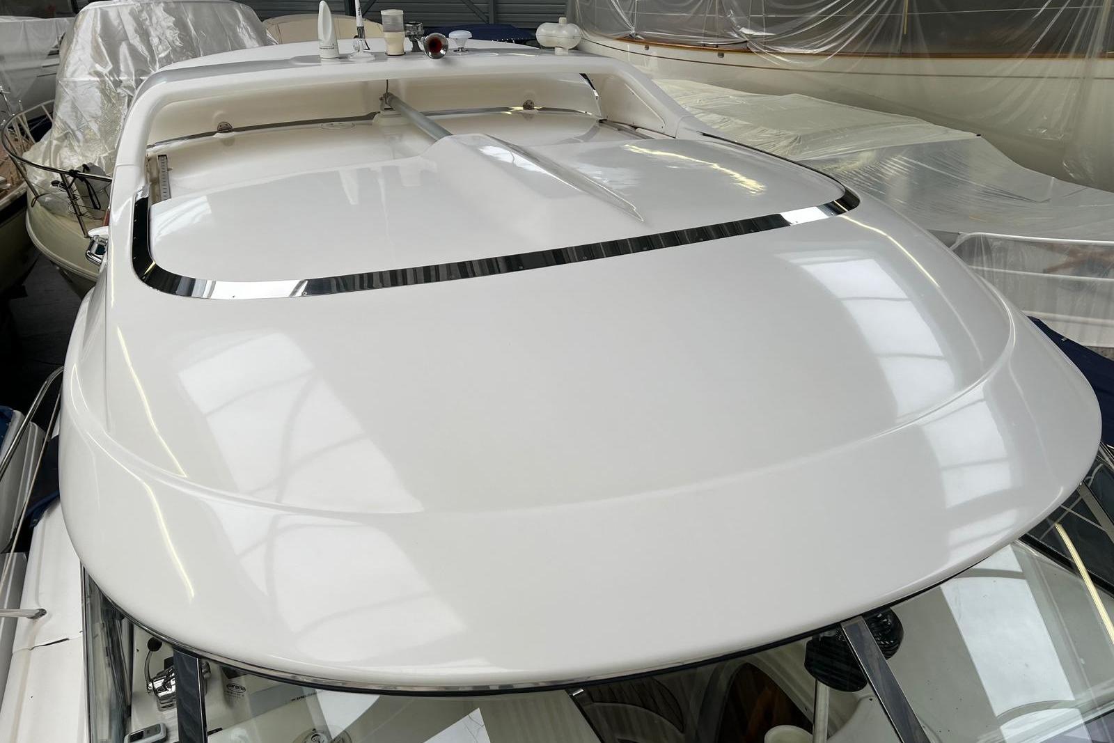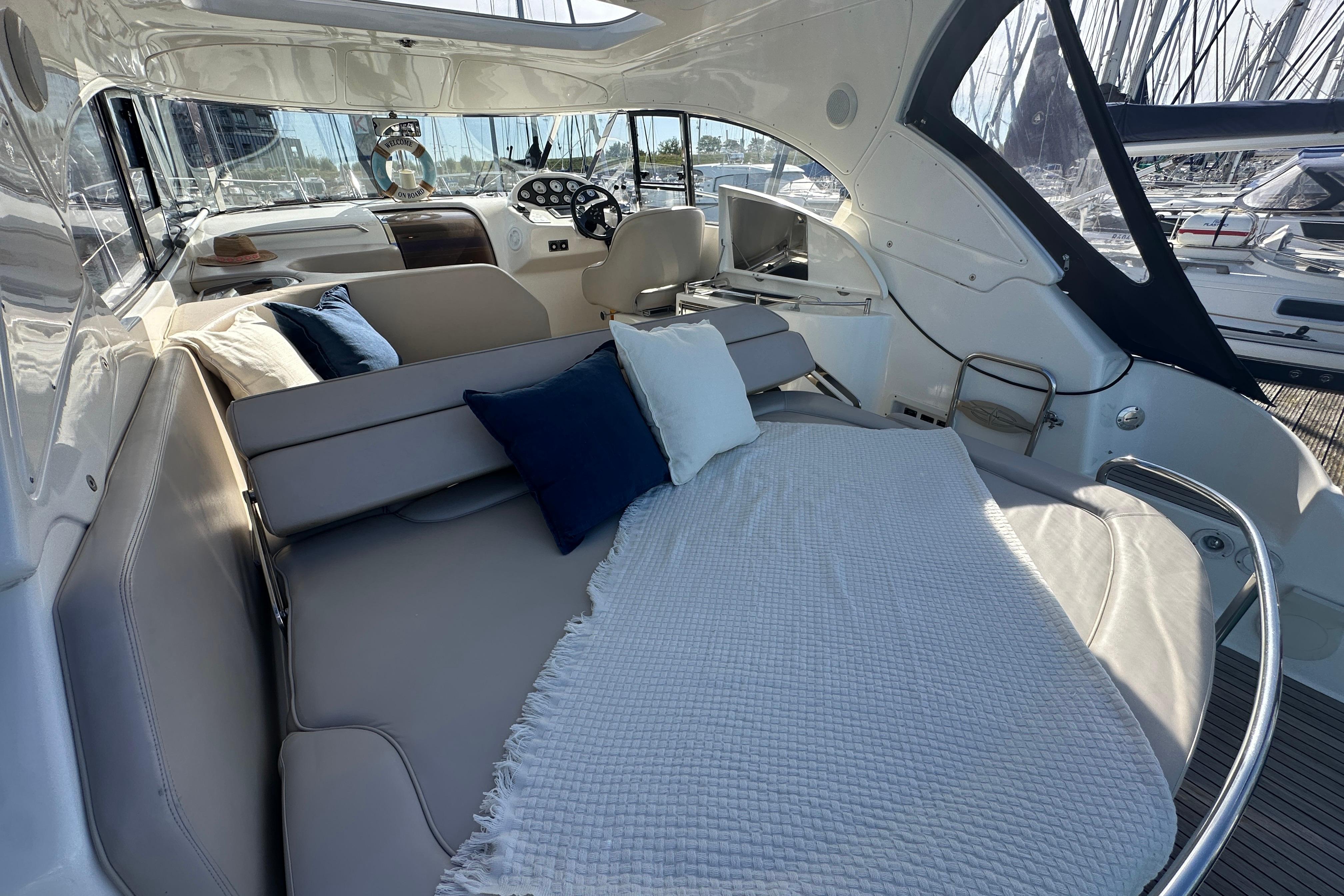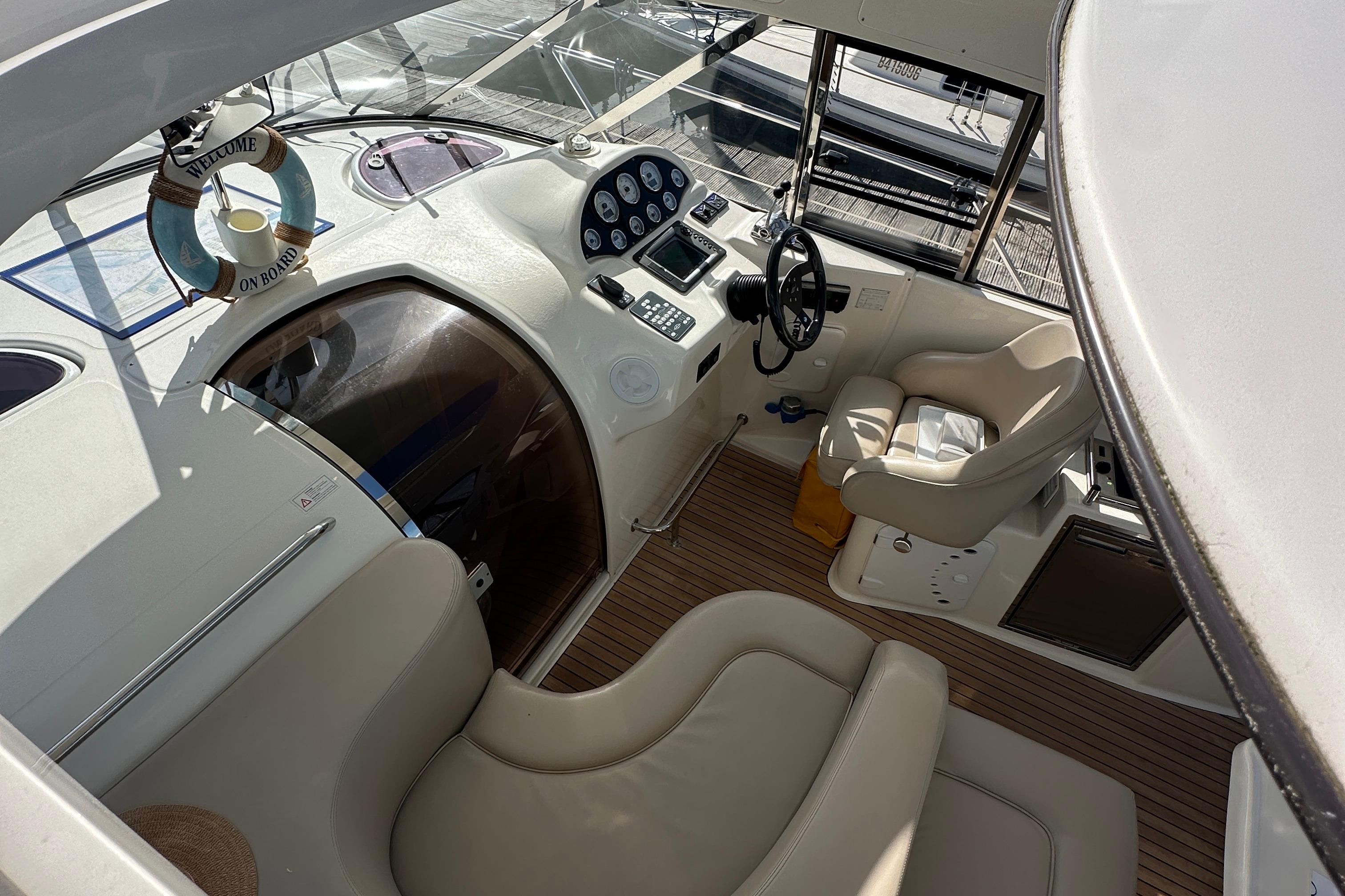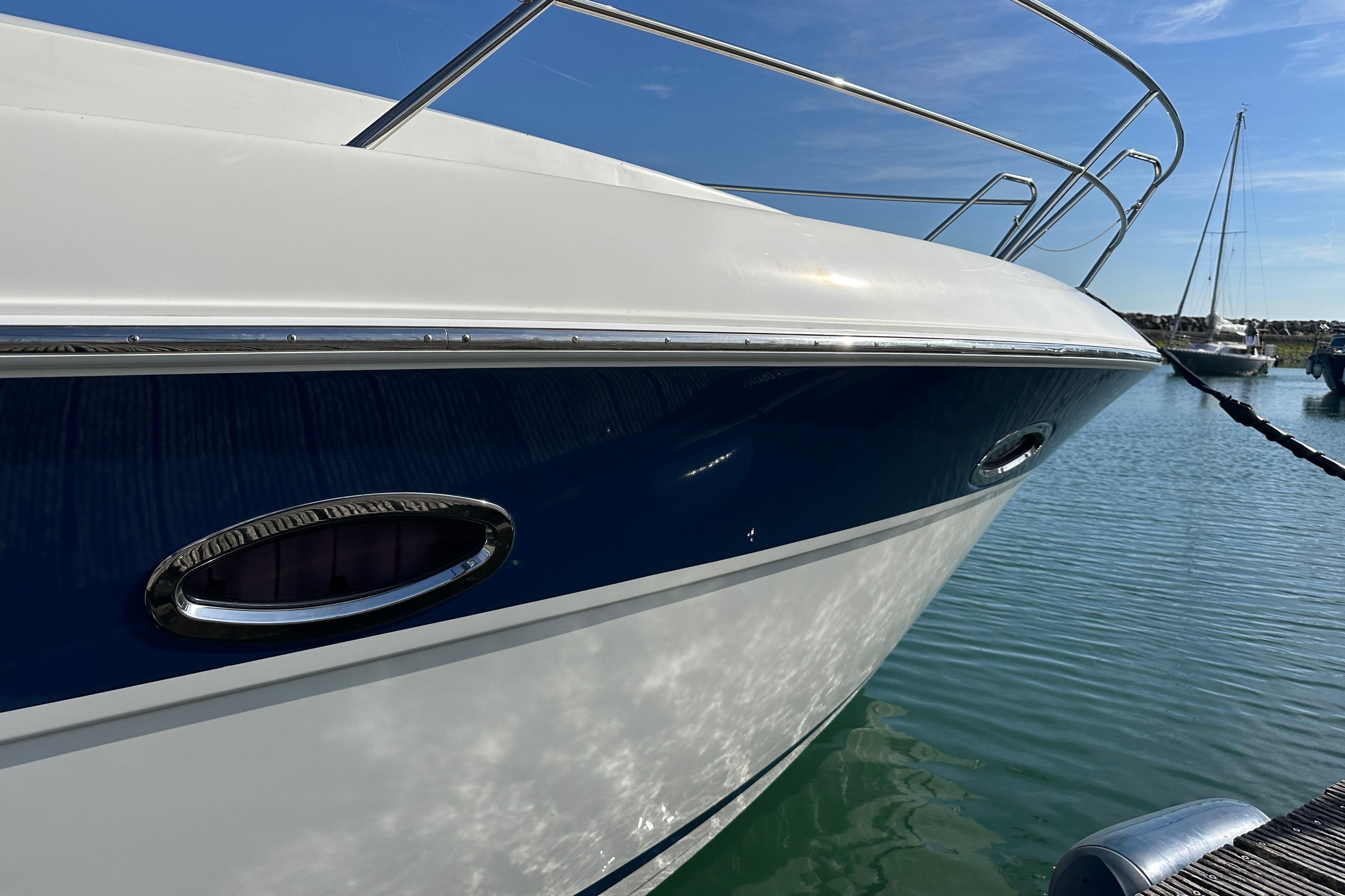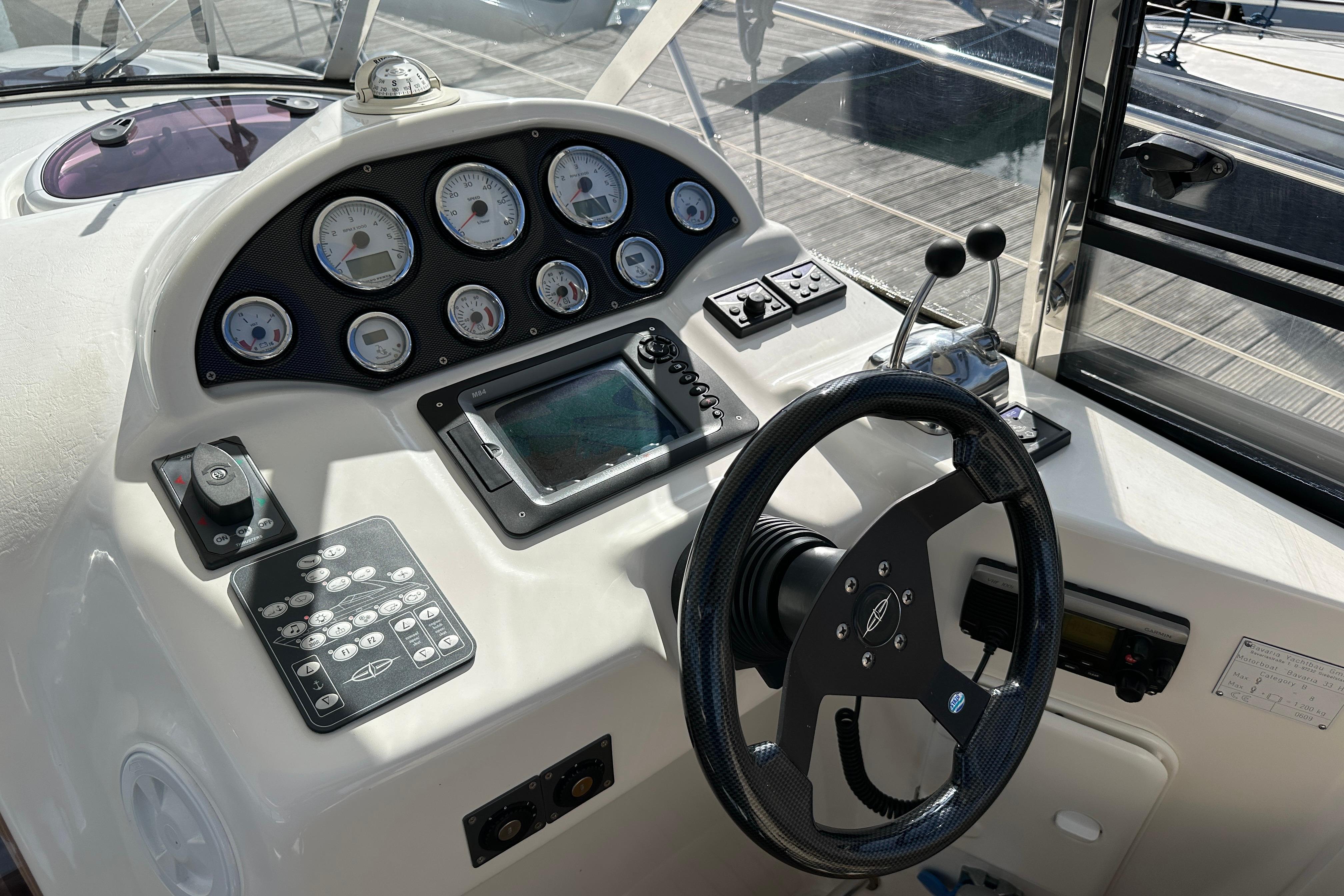 This yacht is in exceptional condition. Recent upgrades include a new canopy, freshly resprayed blue hull band, a new stern thruster, and more.