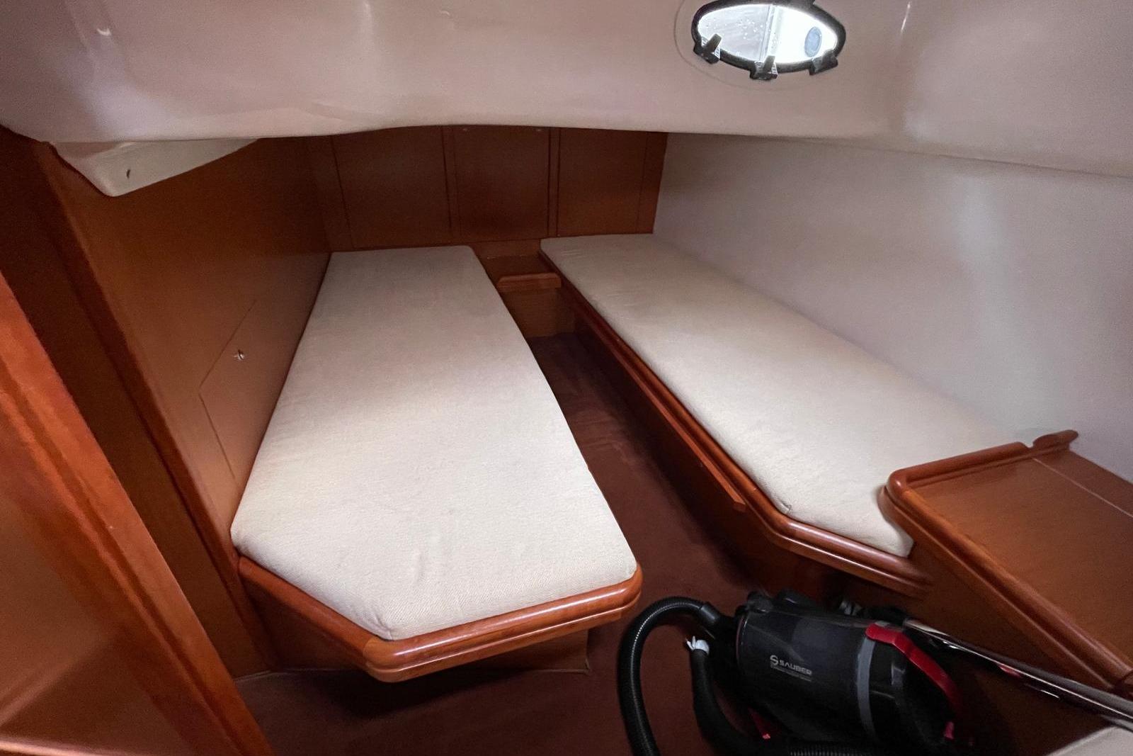 The Bavaria 33 features a spacious, well-designed interior with two private cabins, each separated by doors, offering comfortable accommodation for up to four people.