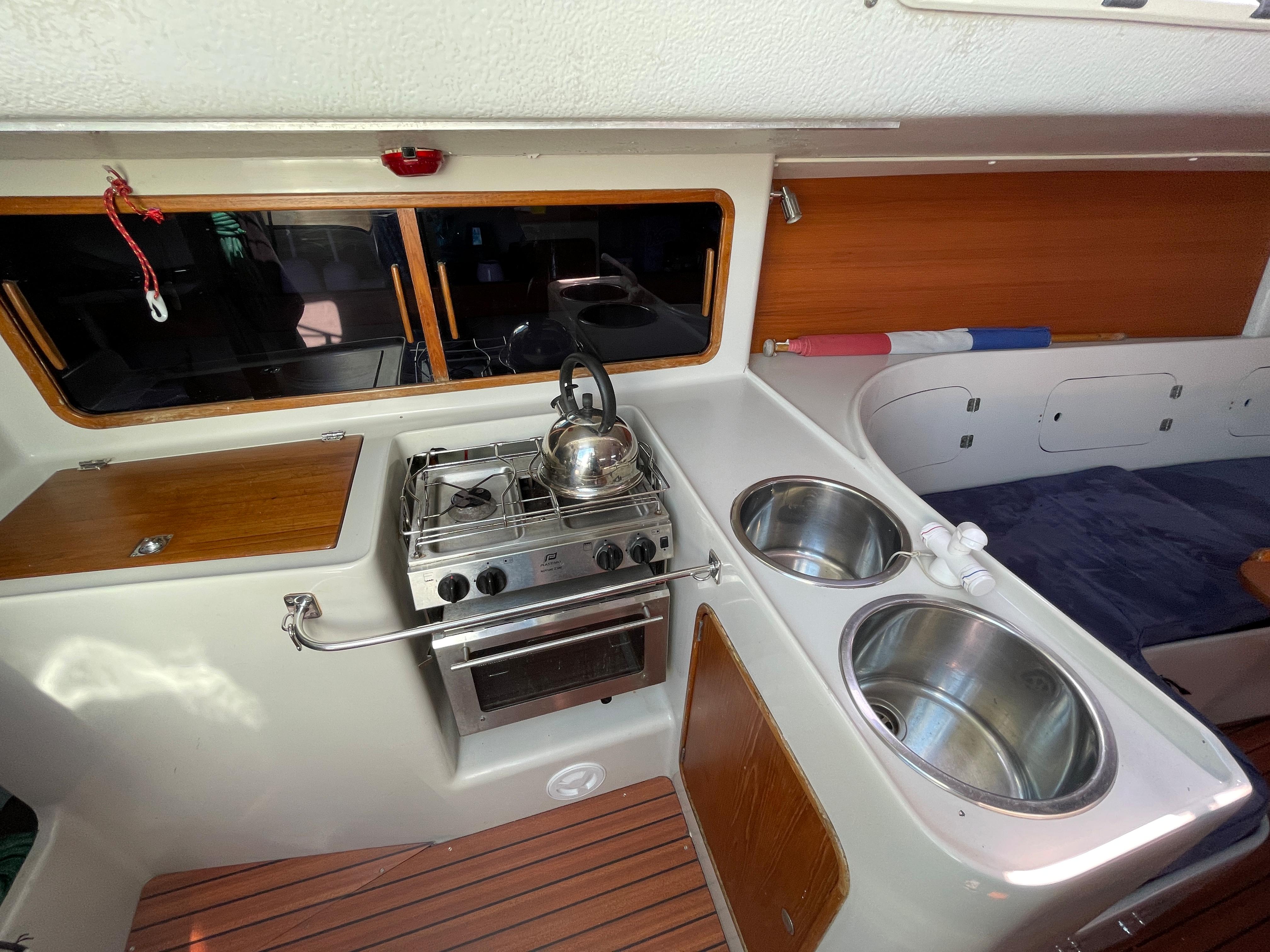 Galley with 2-burner gas stove & oven, deep stainless sinks, large fridge