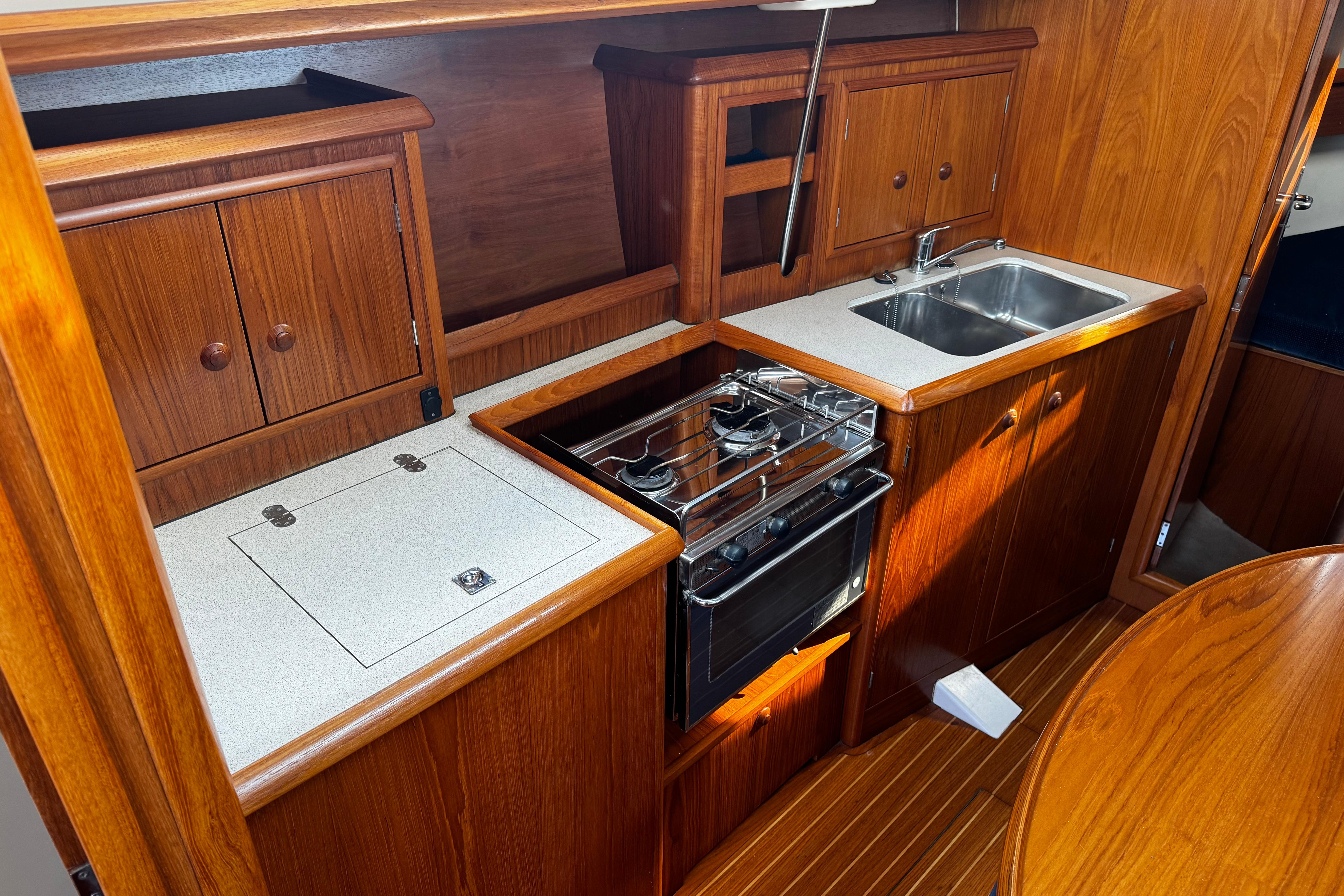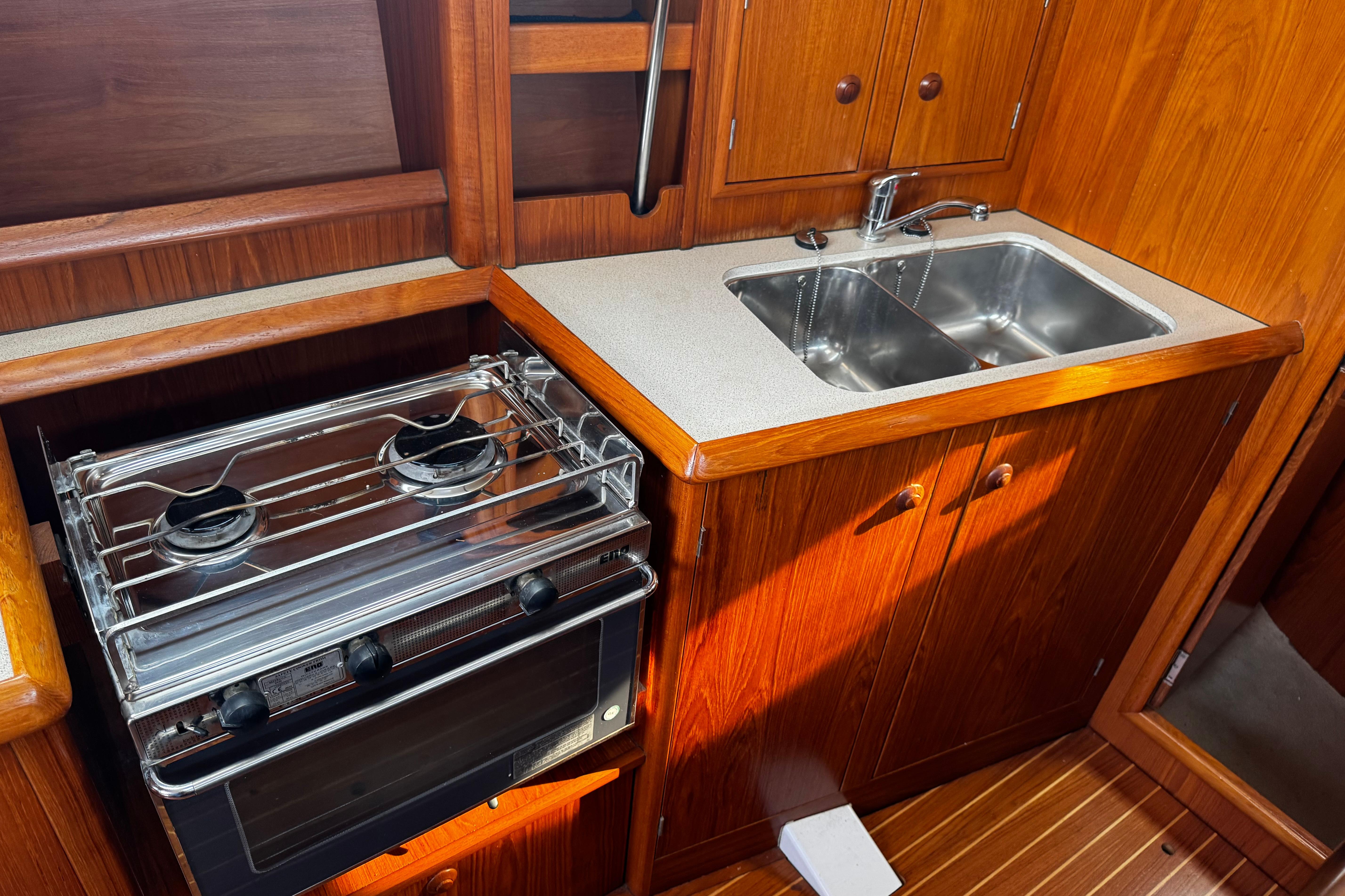 Practical galley with double sink, oven, and refrigerator—perfect for extended cruising