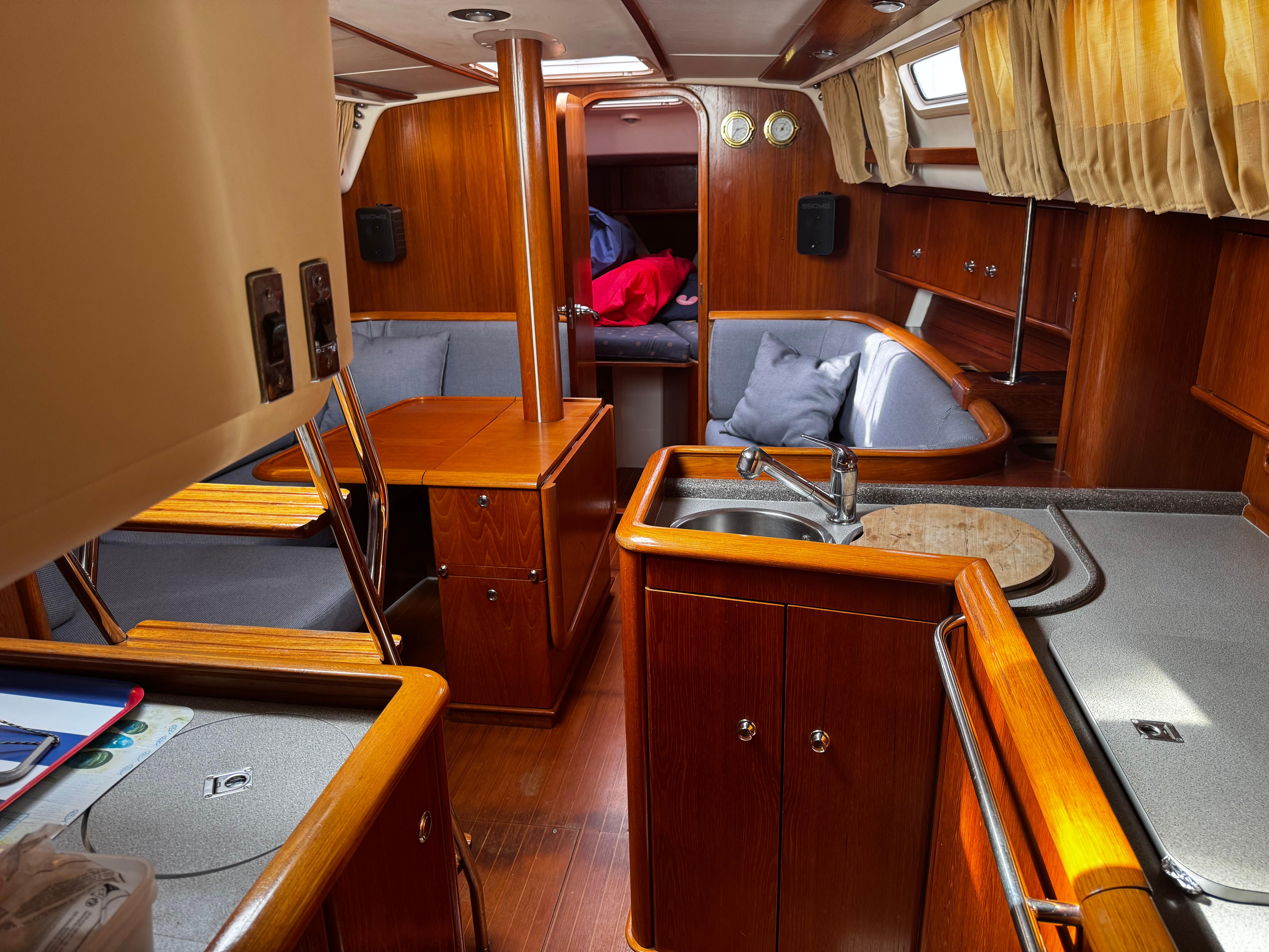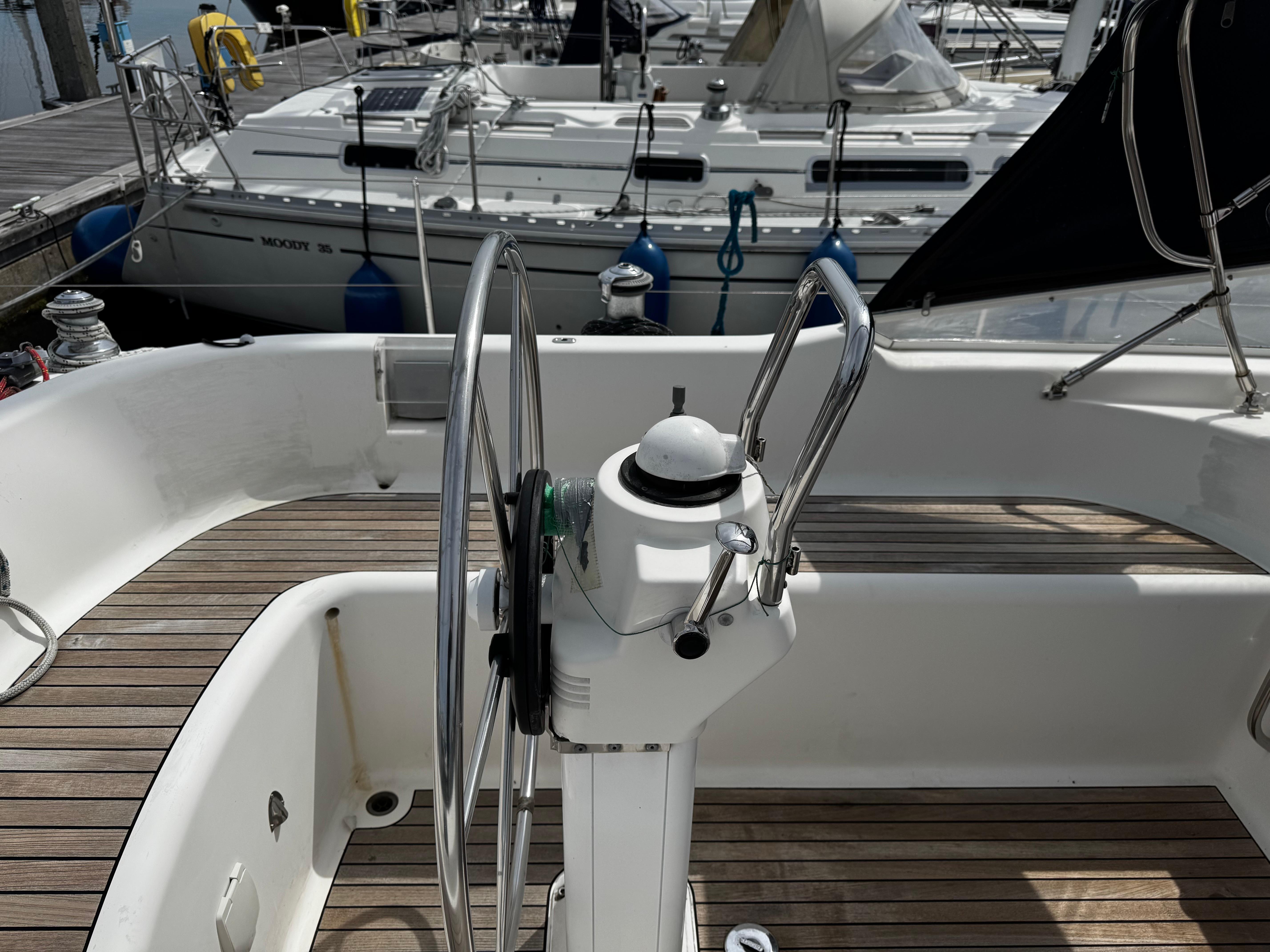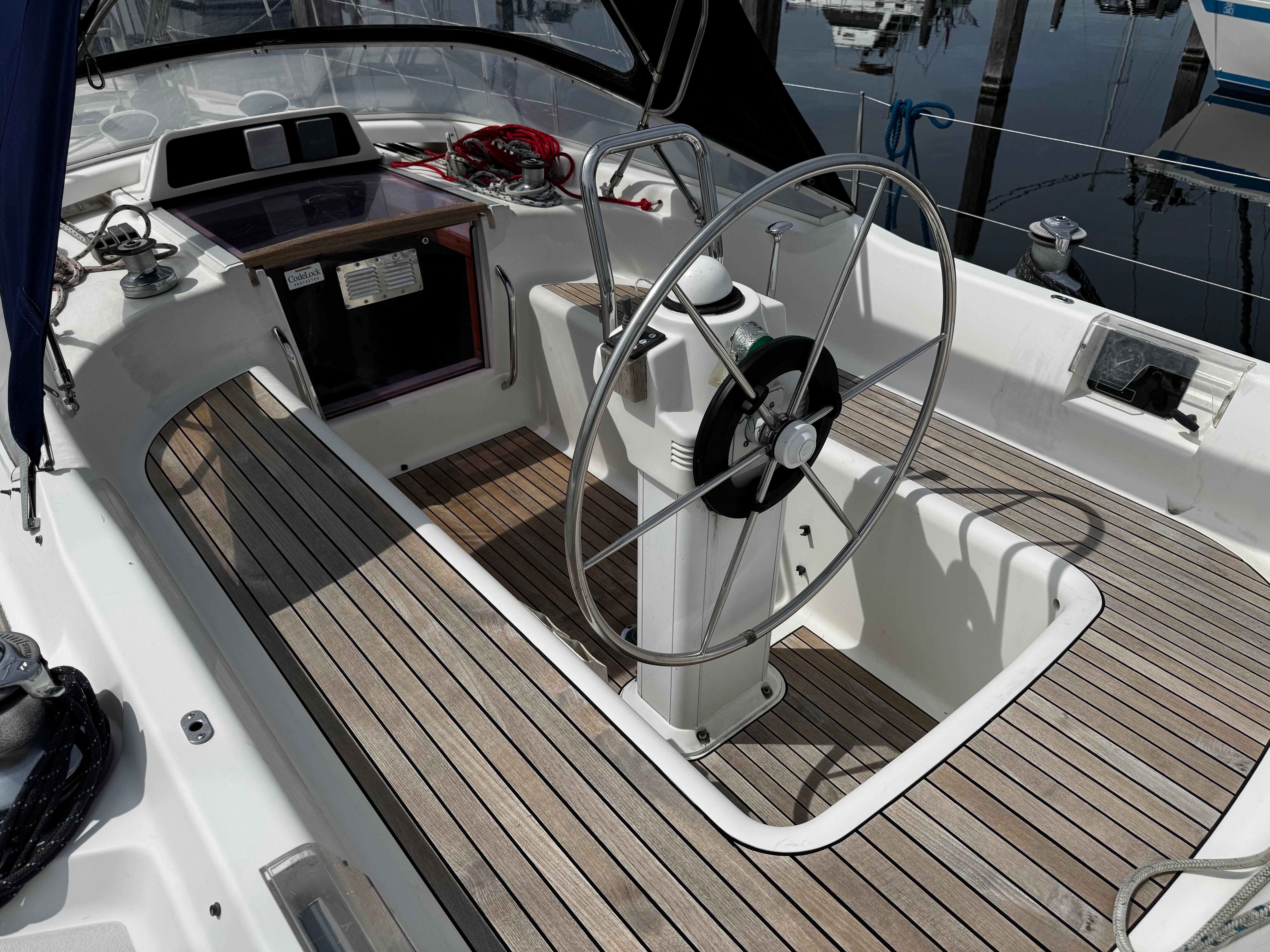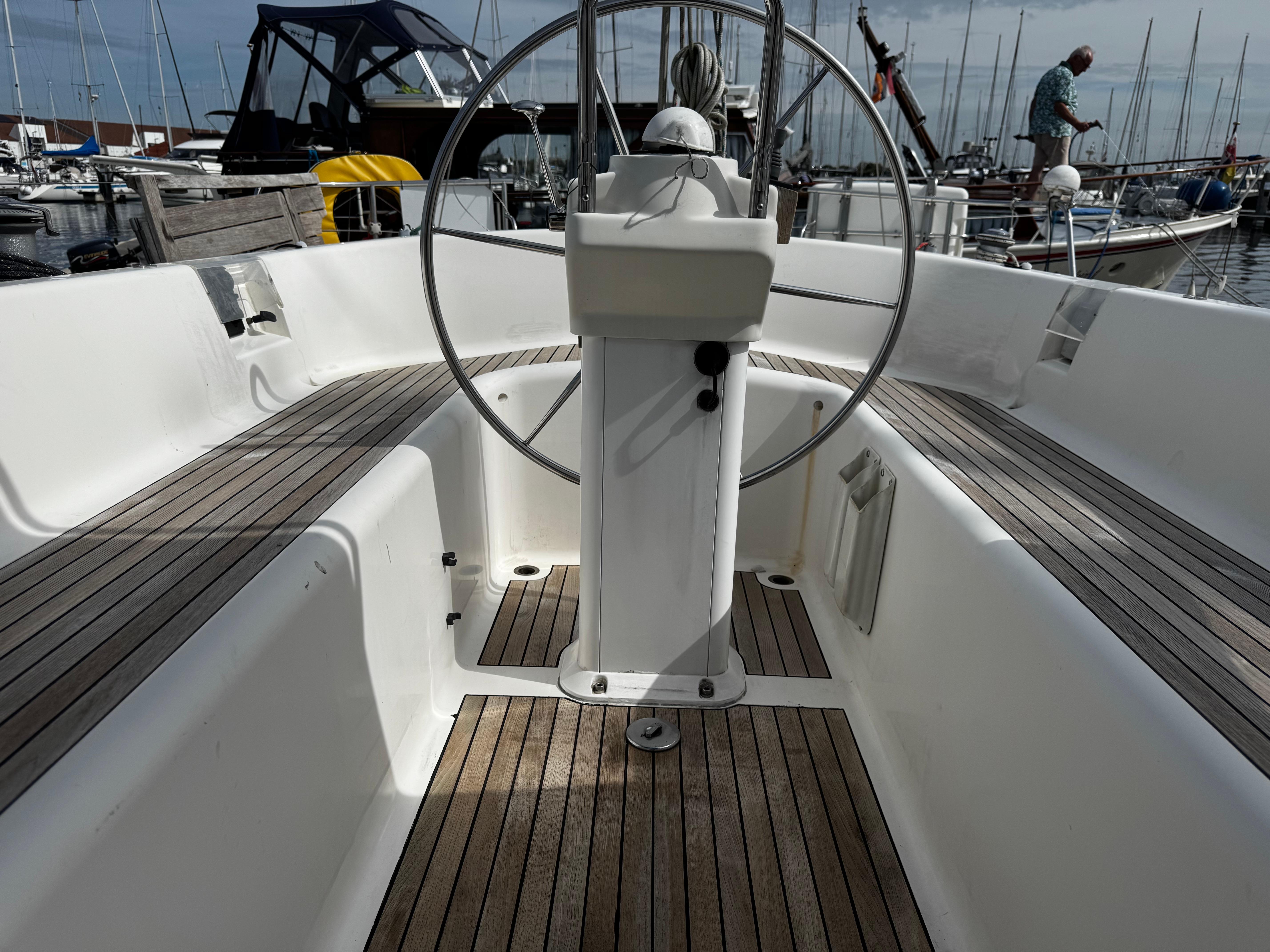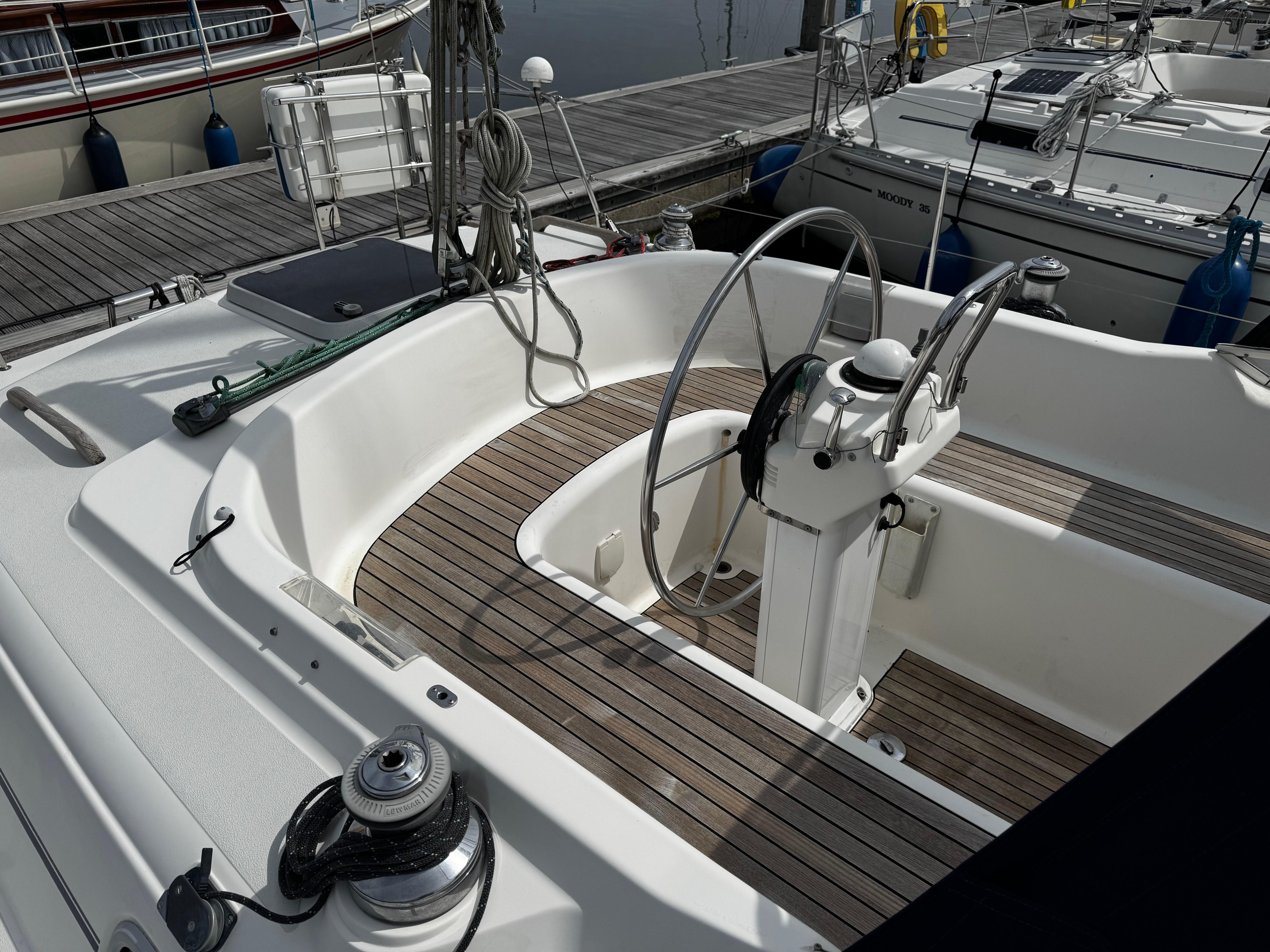 The rig is conservative and well laid out, perfect for sailing with a small crew or even single-handed. All lines lead back to the cockpit, and the winches are within easy reach. A sturdy sprayhood provides protection in bad weather. Maneuvering under sail or power is straightforward, aided by the dependable engine installation and good visibility from the helm.