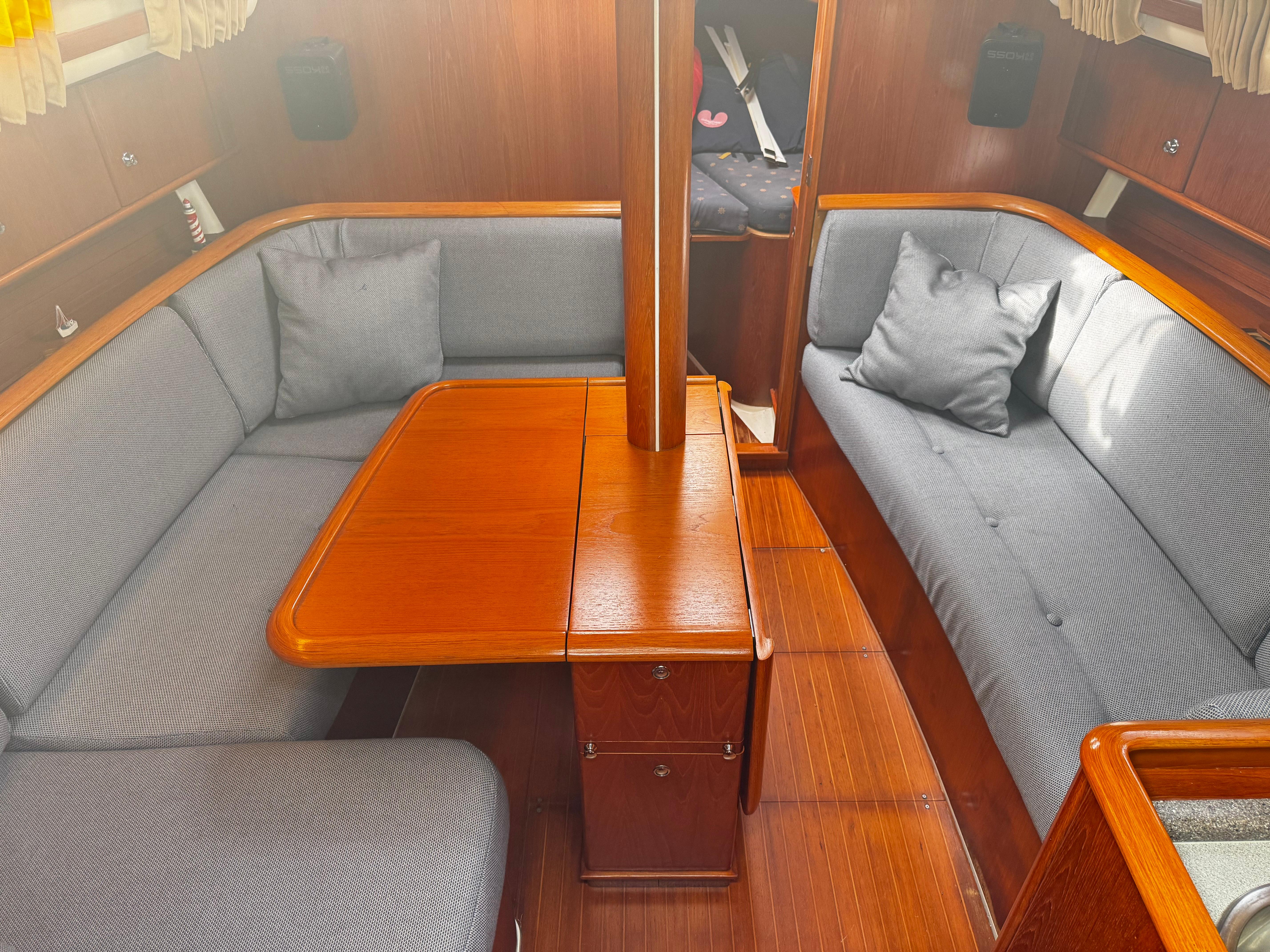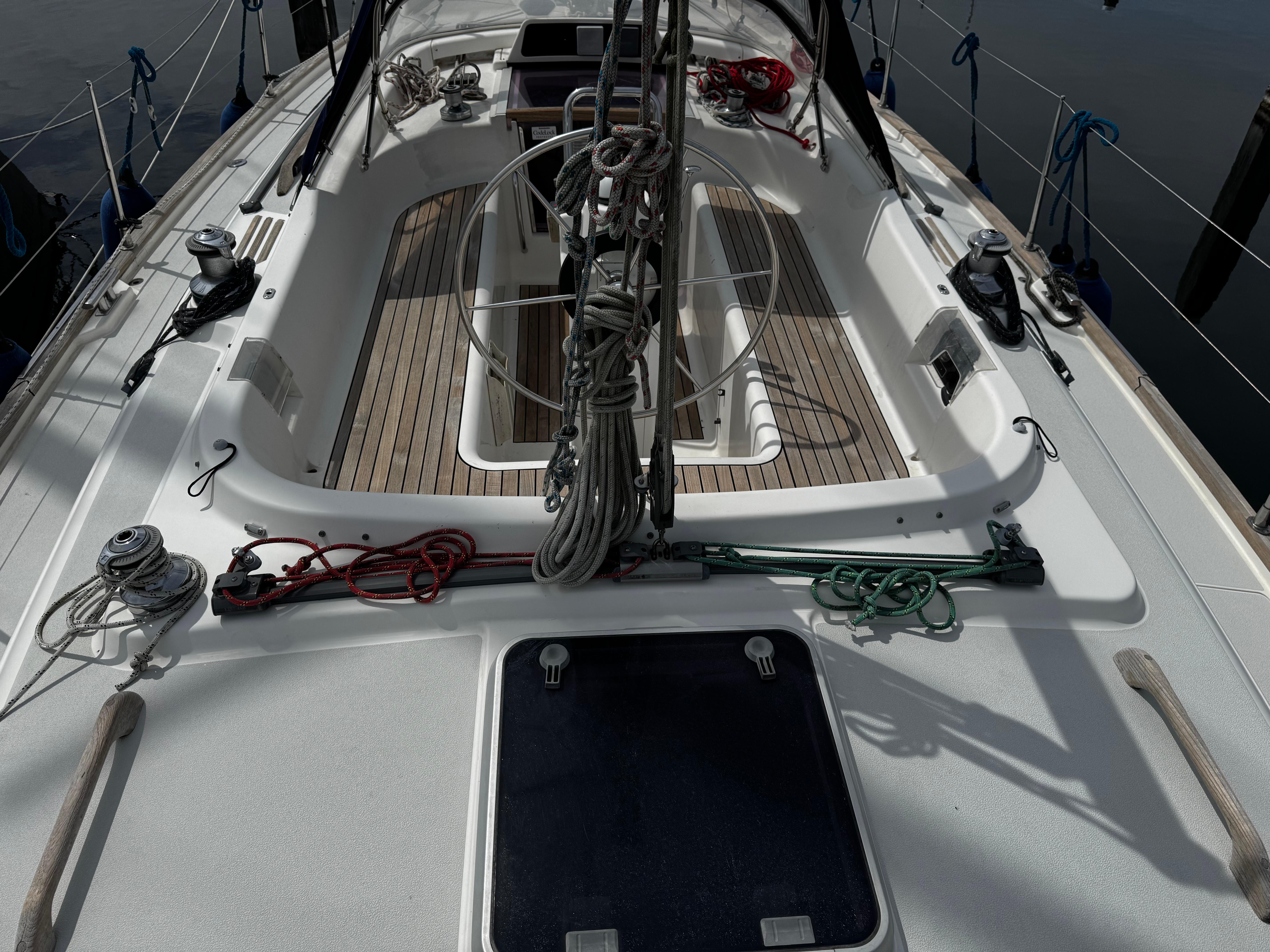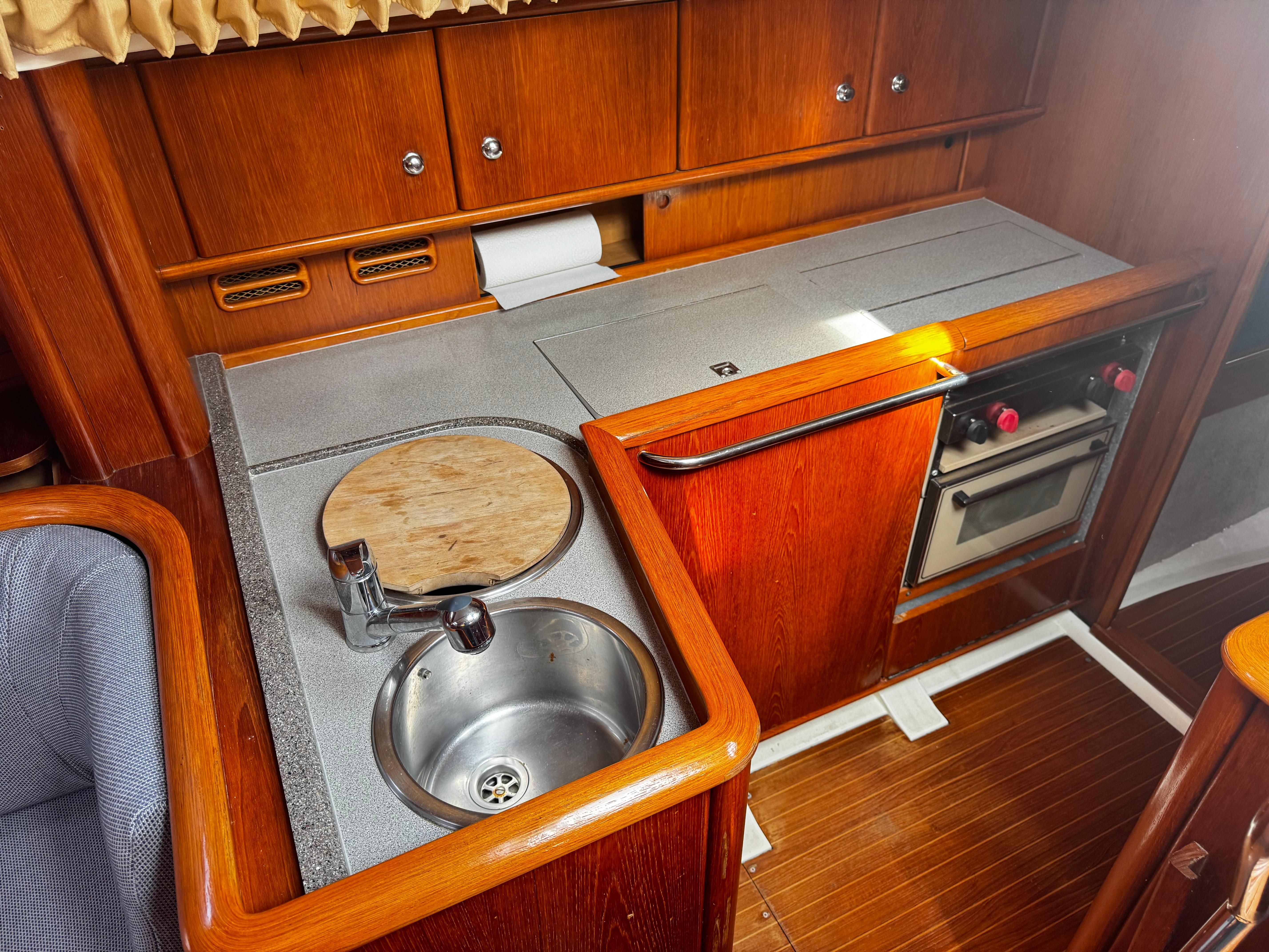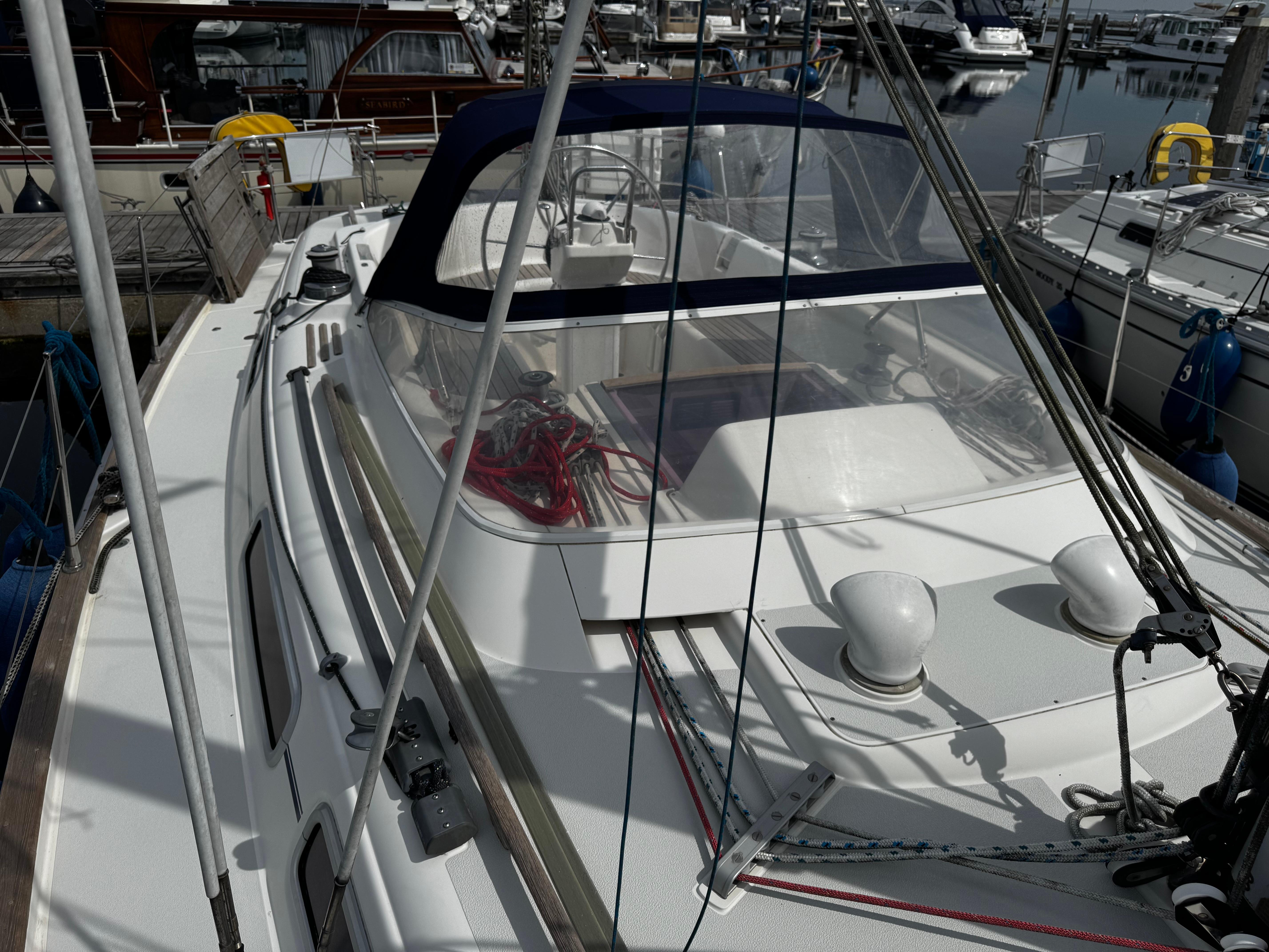 The rig is conservative and well laid out, perfect for sailing with a small crew or even single-handed. All lines lead back to the cockpit, and the winches are within easy reach. A sturdy sprayhood provides protection in bad weather. Maneuvering under sail or power is straightforward, aided by the dependable engine installation and good visibility from the helm.