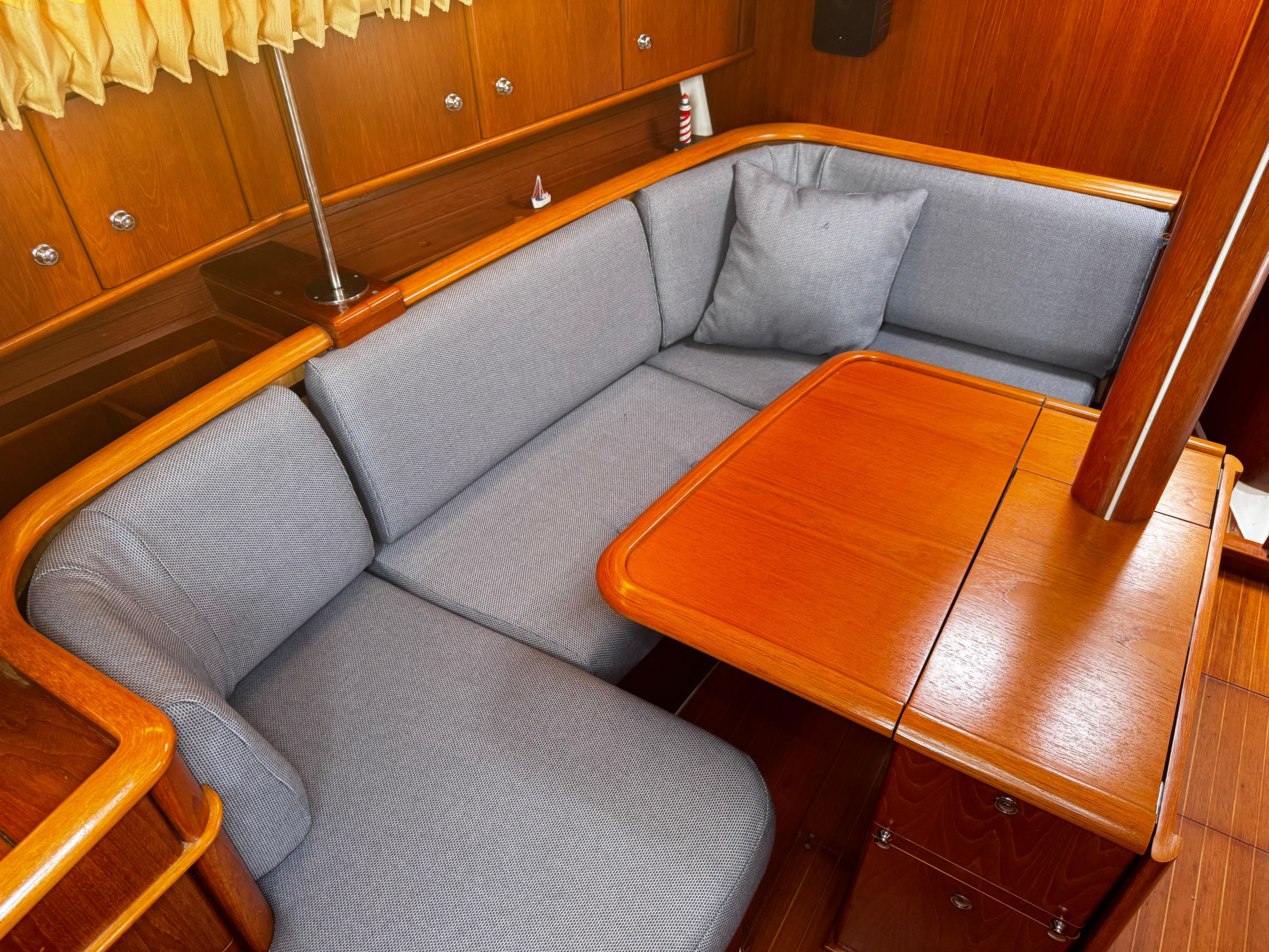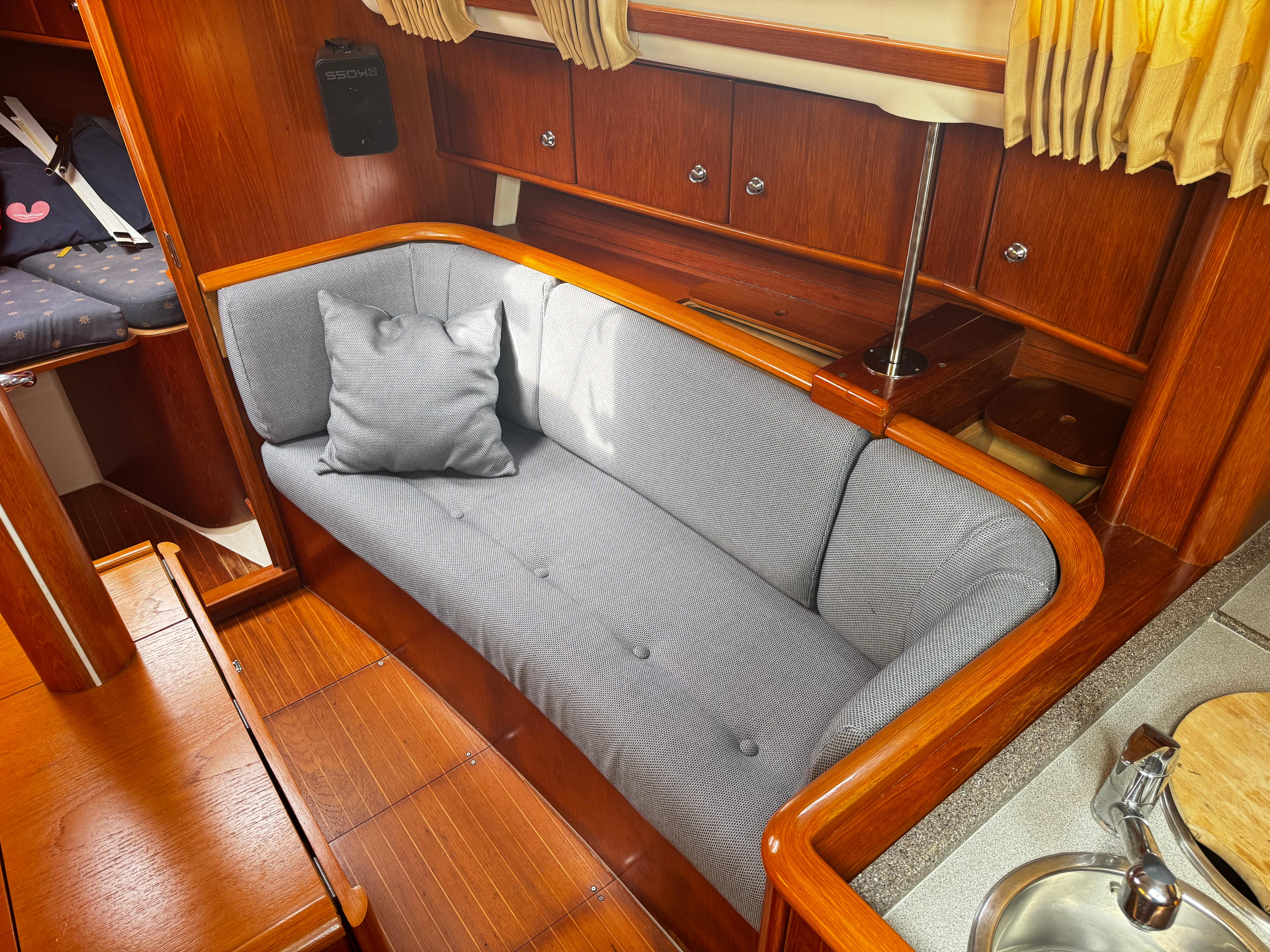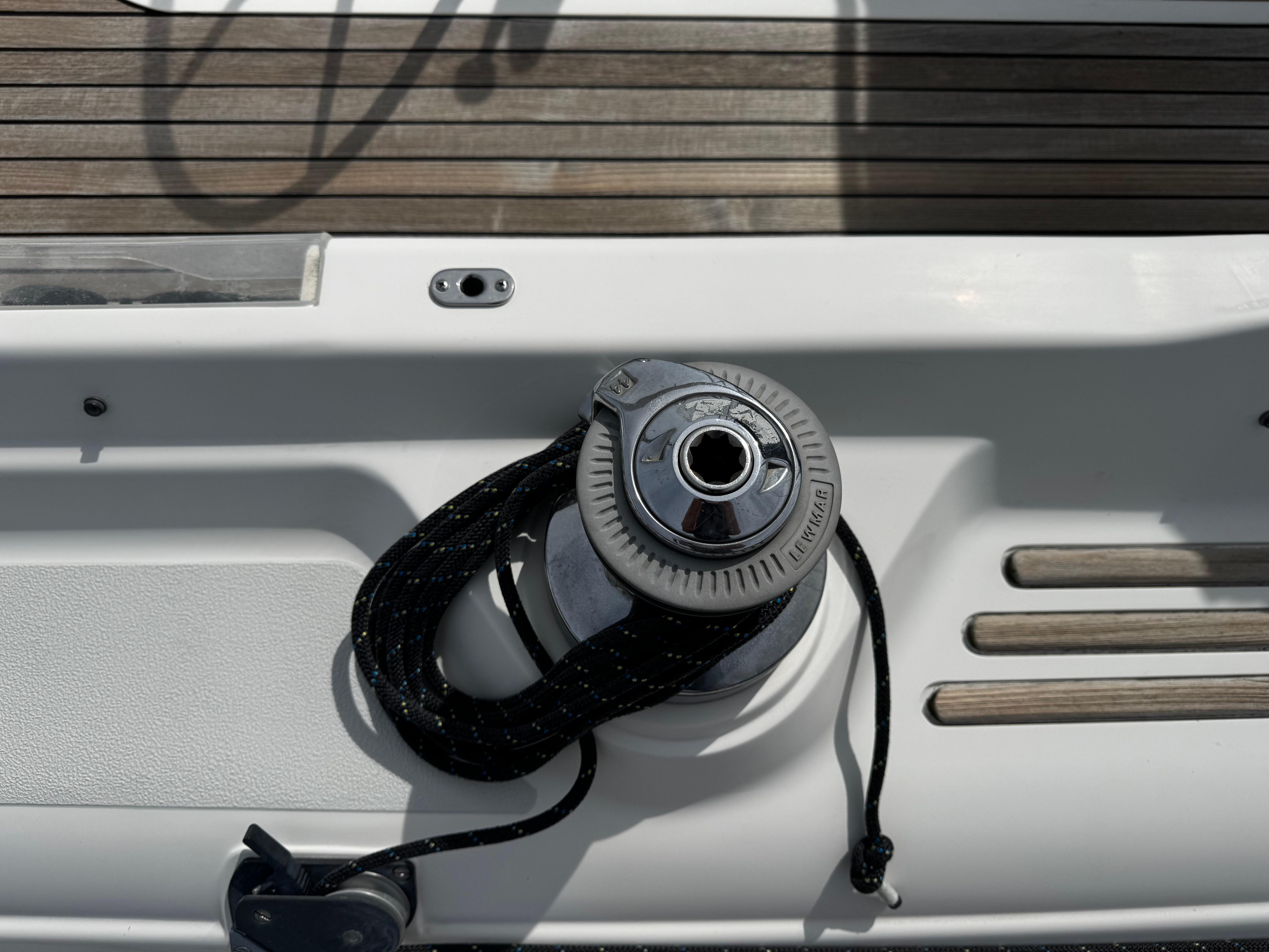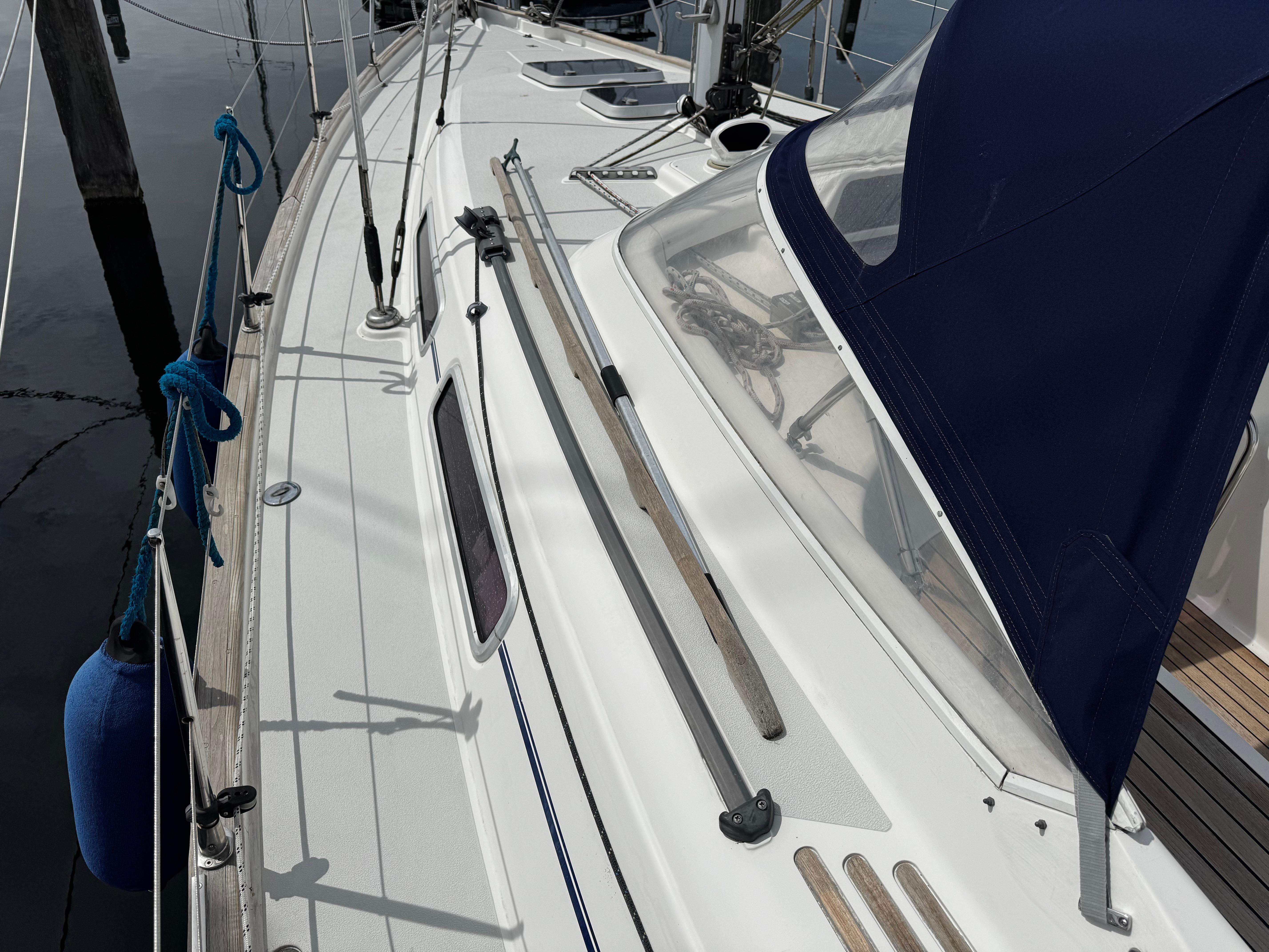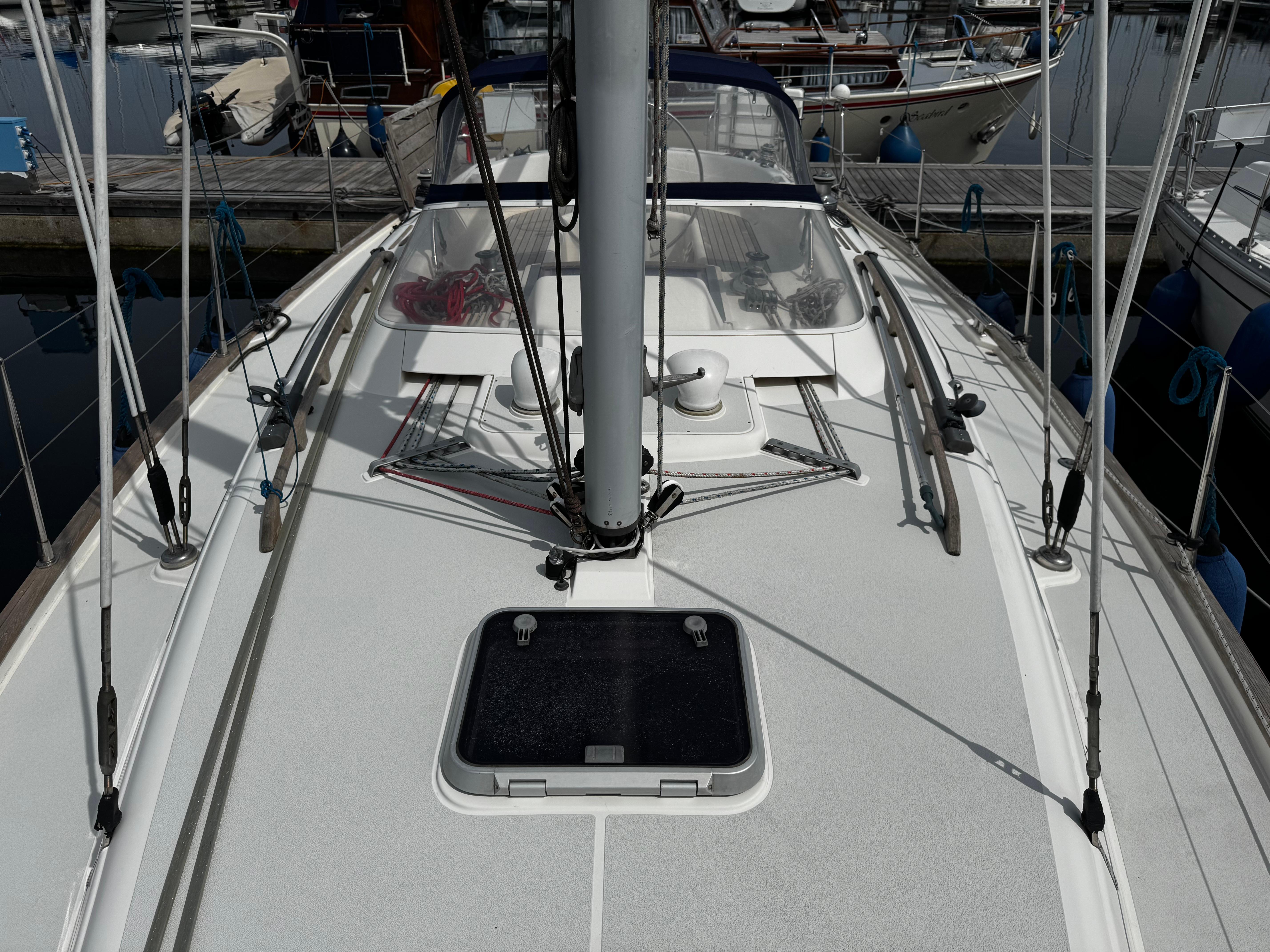The rig is conservative and well laid out, perfect for sailing with a small crew or even single-handed. All lines lead back to the cockpit, and the winches are within easy reach. A sturdy sprayhood provides protection in bad weather. Maneuvering under sail or power is straightforward, aided by the dependable engine installation and good visibility from the helm.