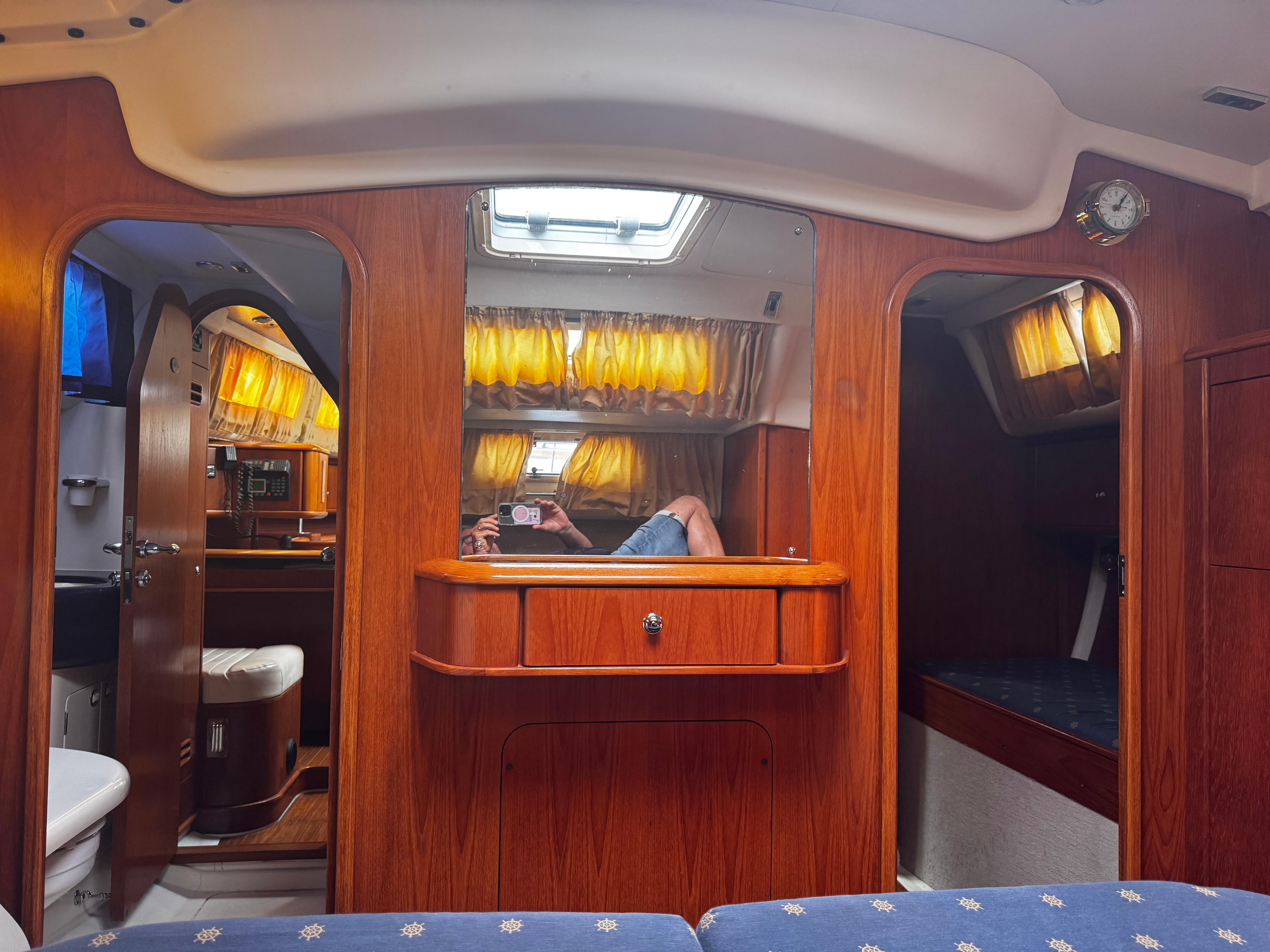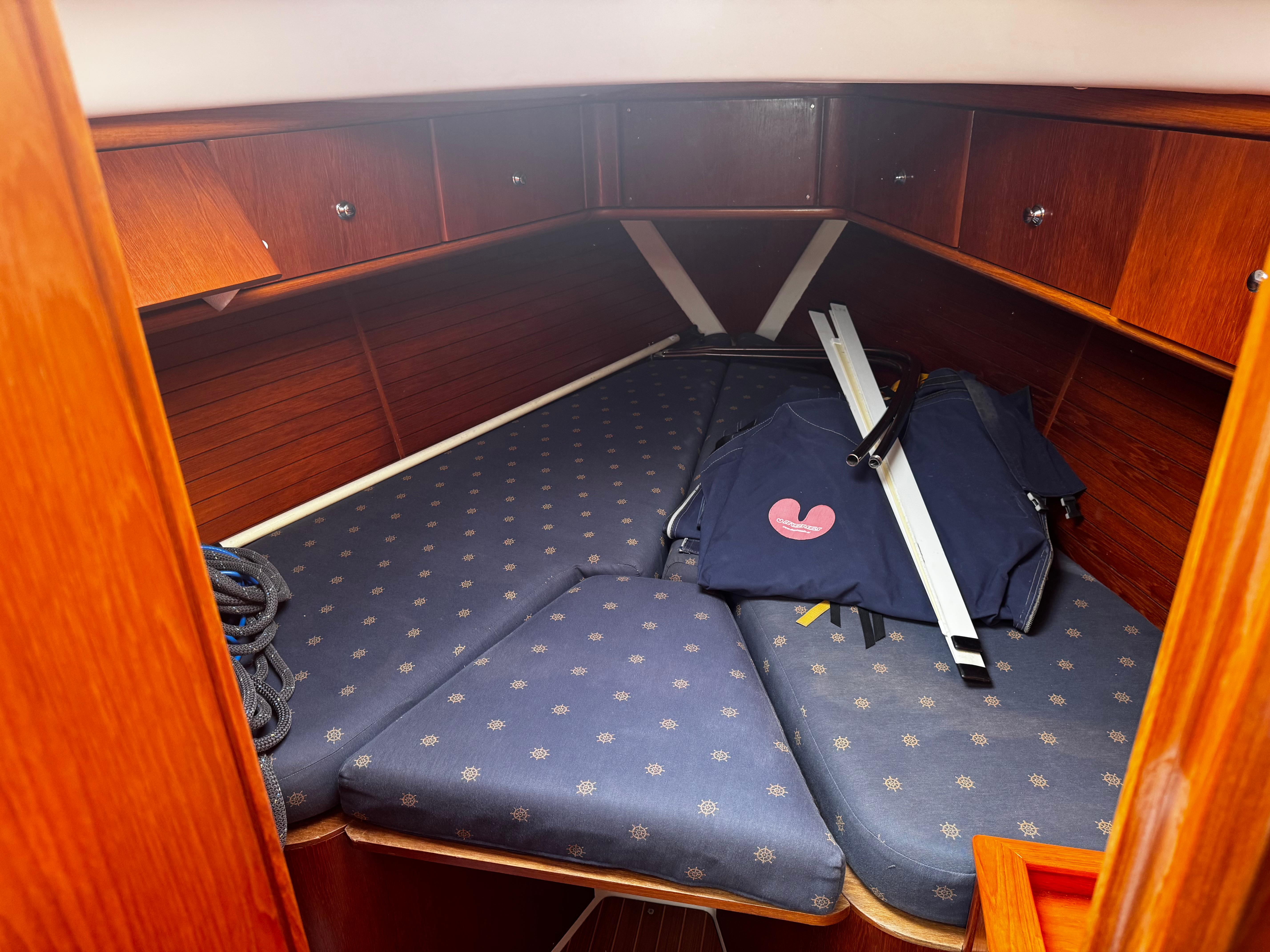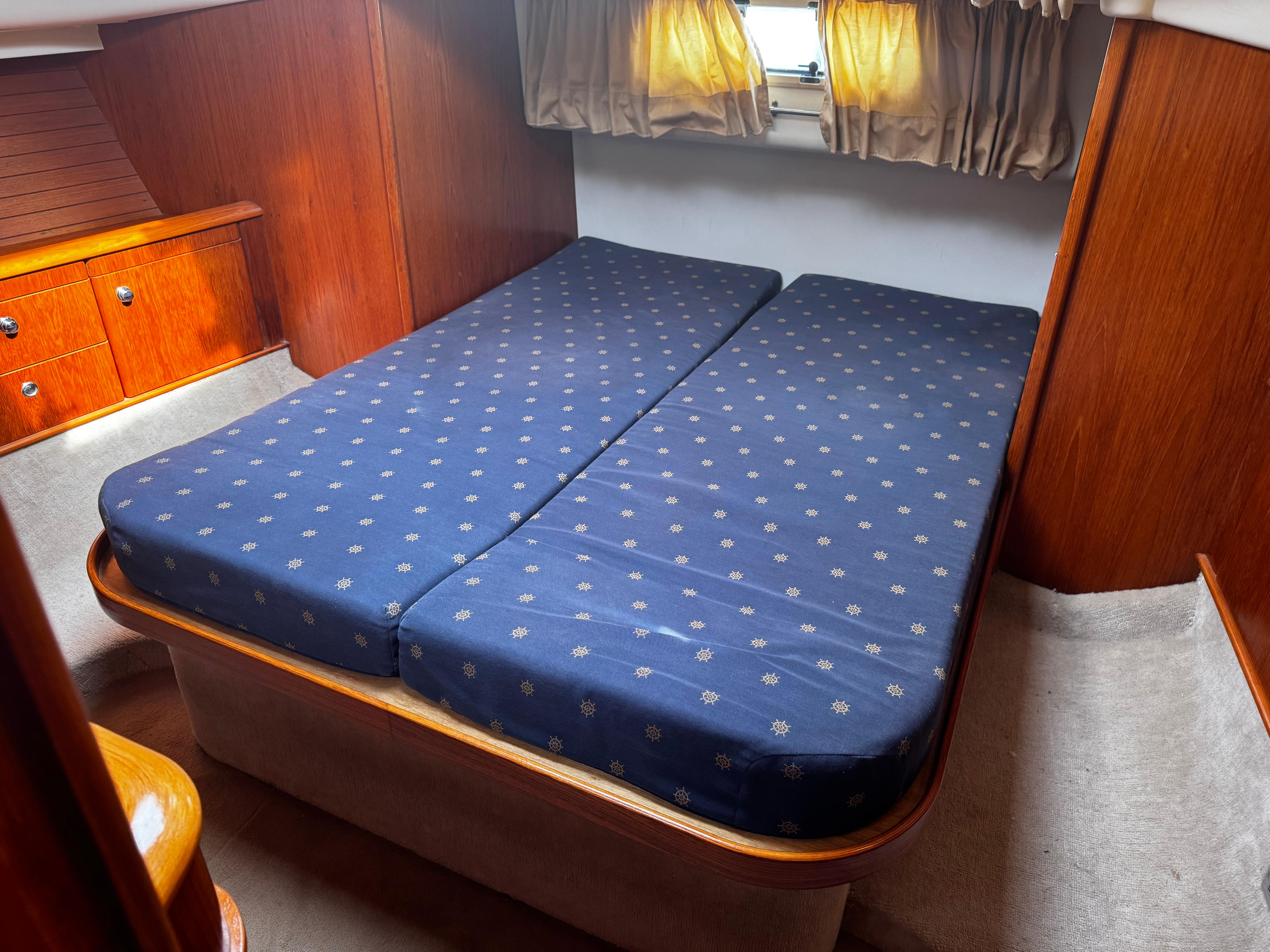 One of the standout features of the Moody 36 CC is her spacious center cockpit. It offers great shelter and comfort with excellent visibility. Thanks to the center cockpit layout, there is room below deck for a large aft owner’s cabin, featuring a double berth and private access to the head. A second forward cabin offers space for guests, making the yacht ideal for extended stays aboard.