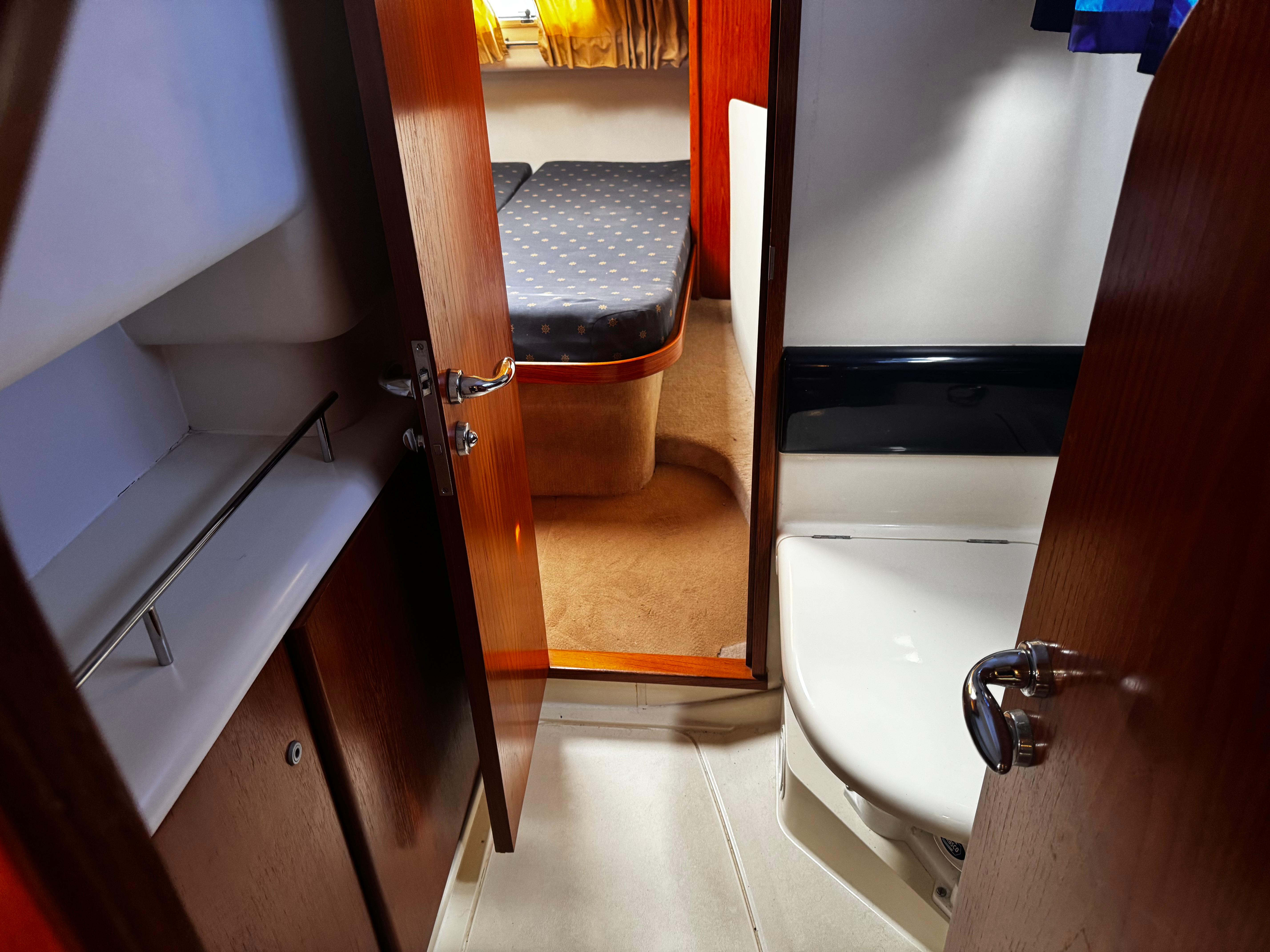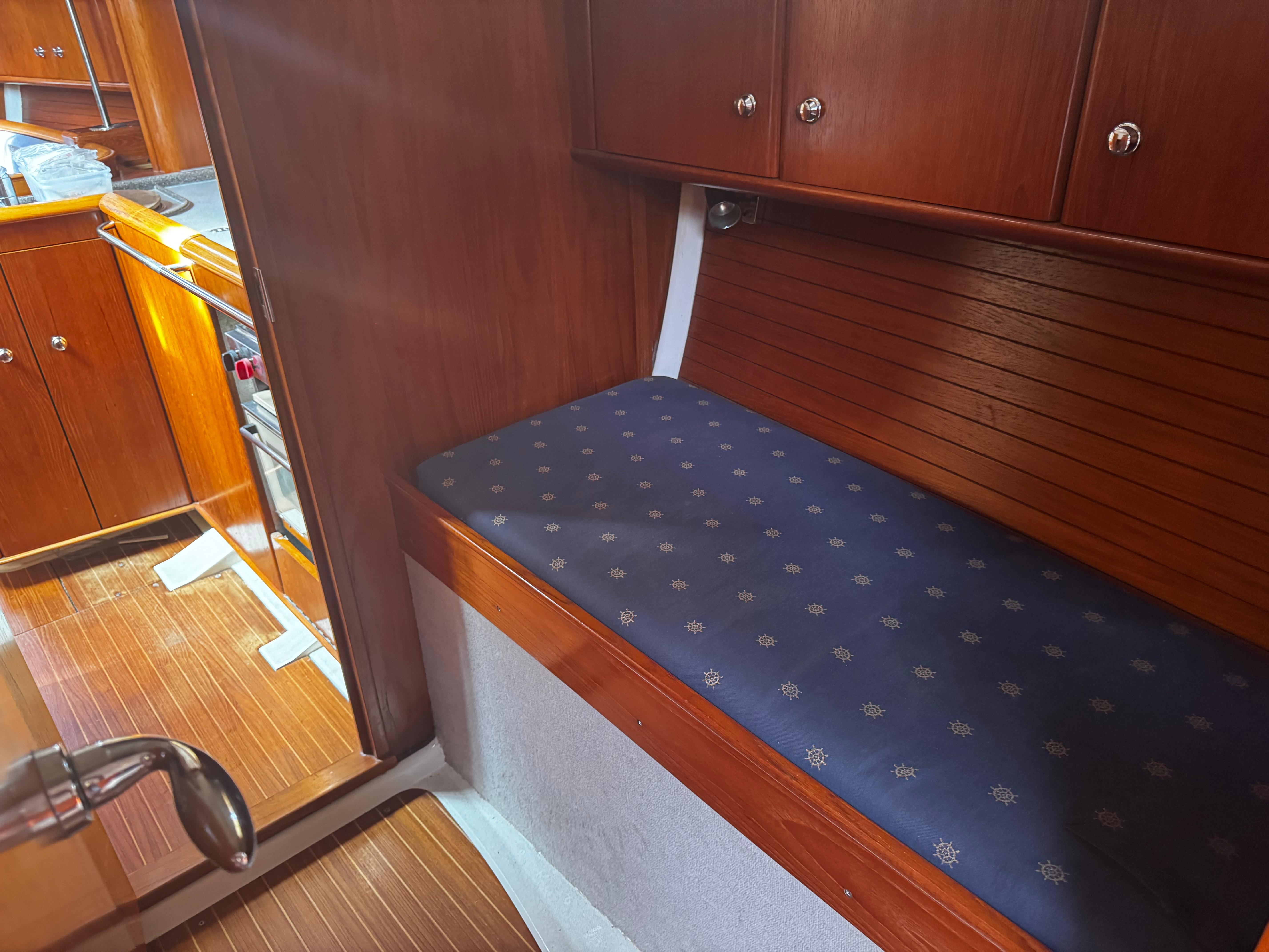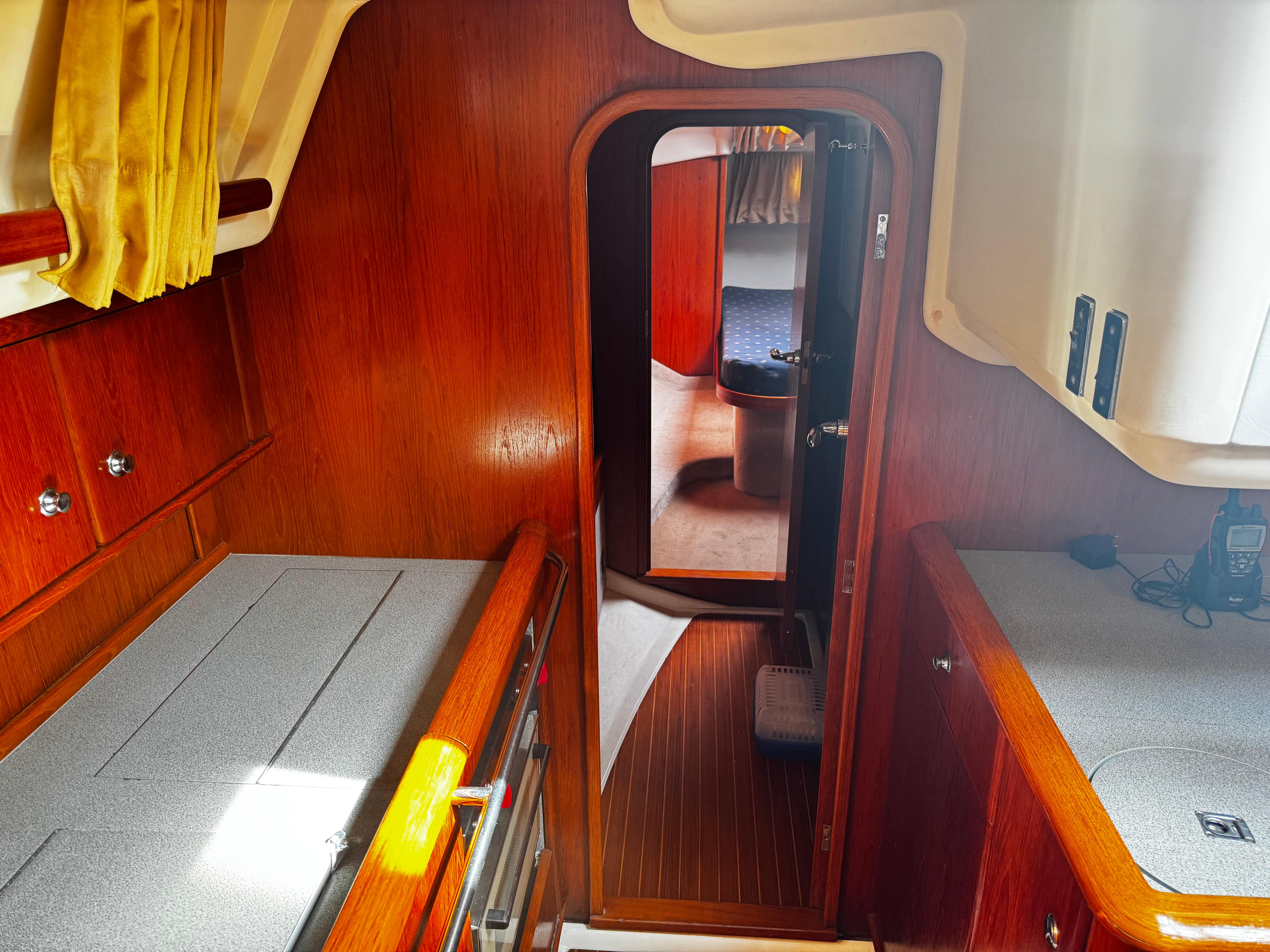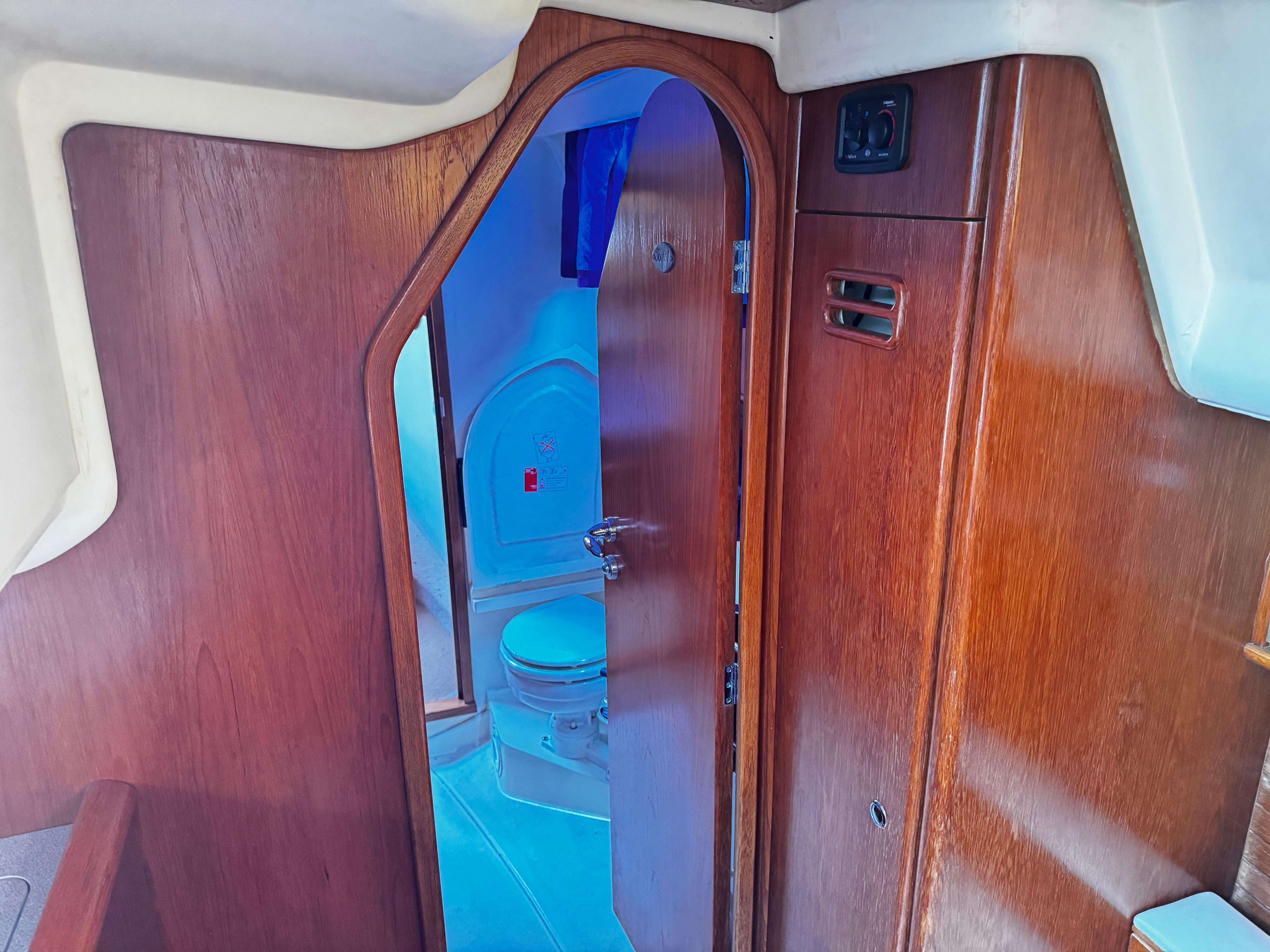 One of the standout features of the Moody 36 CC is her spacious center cockpit. It offers great shelter and comfort with excellent visibility. Thanks to the center cockpit layout, there is room below deck for a large aft owner’s cabin, featuring a double berth and private access to the head. A second forward cabin offers space for guests, making the yacht ideal for extended stays aboard.
