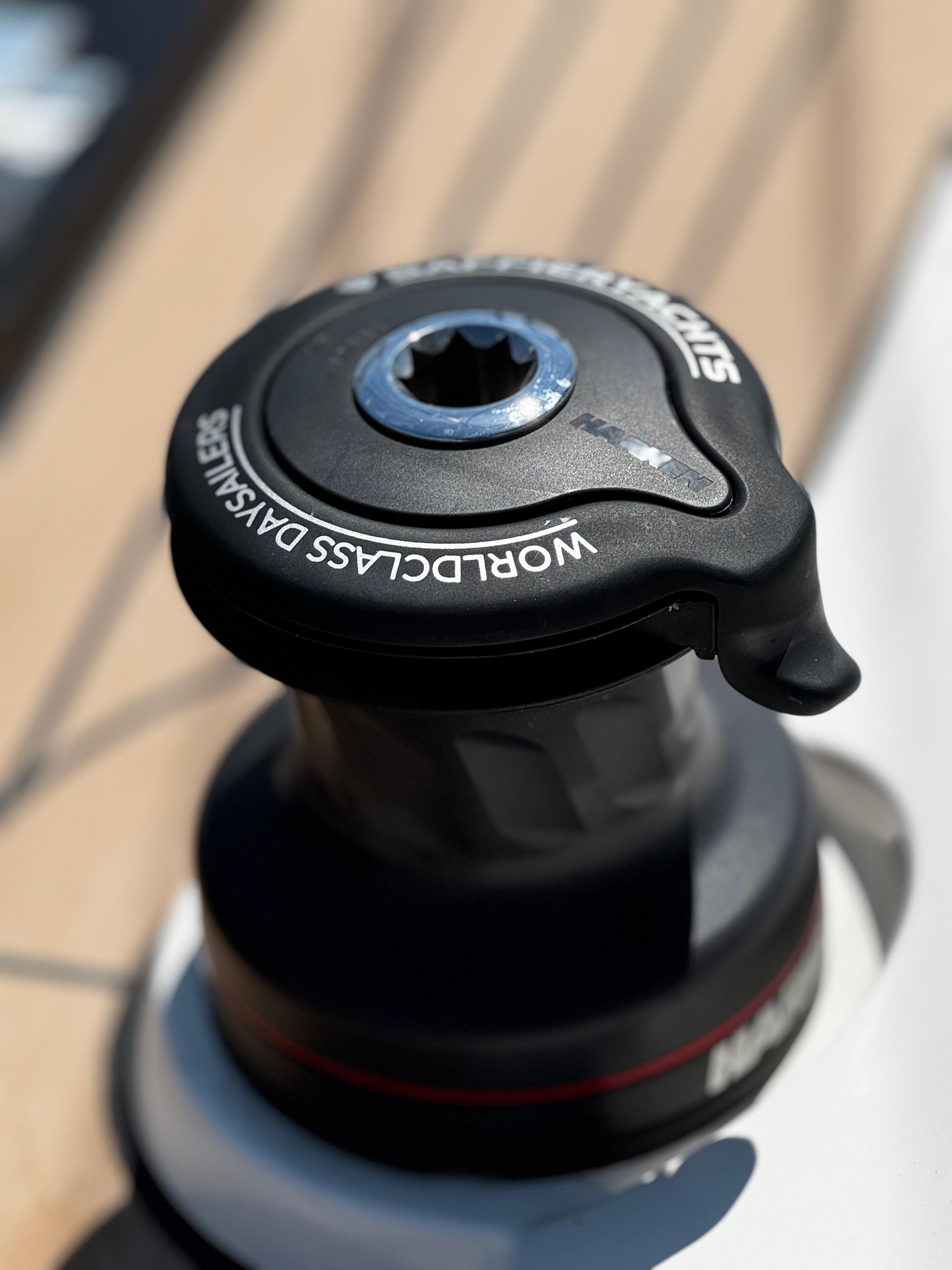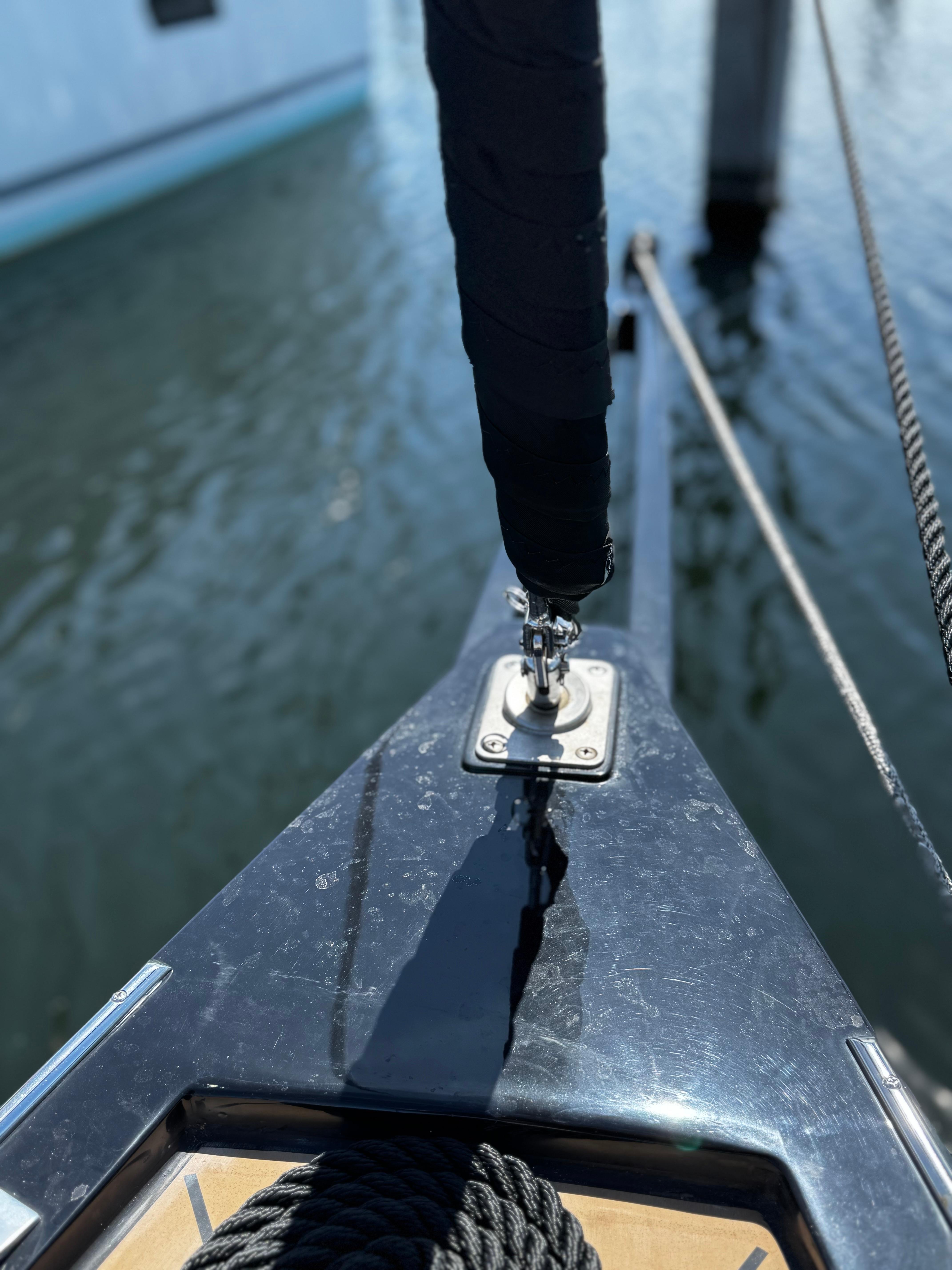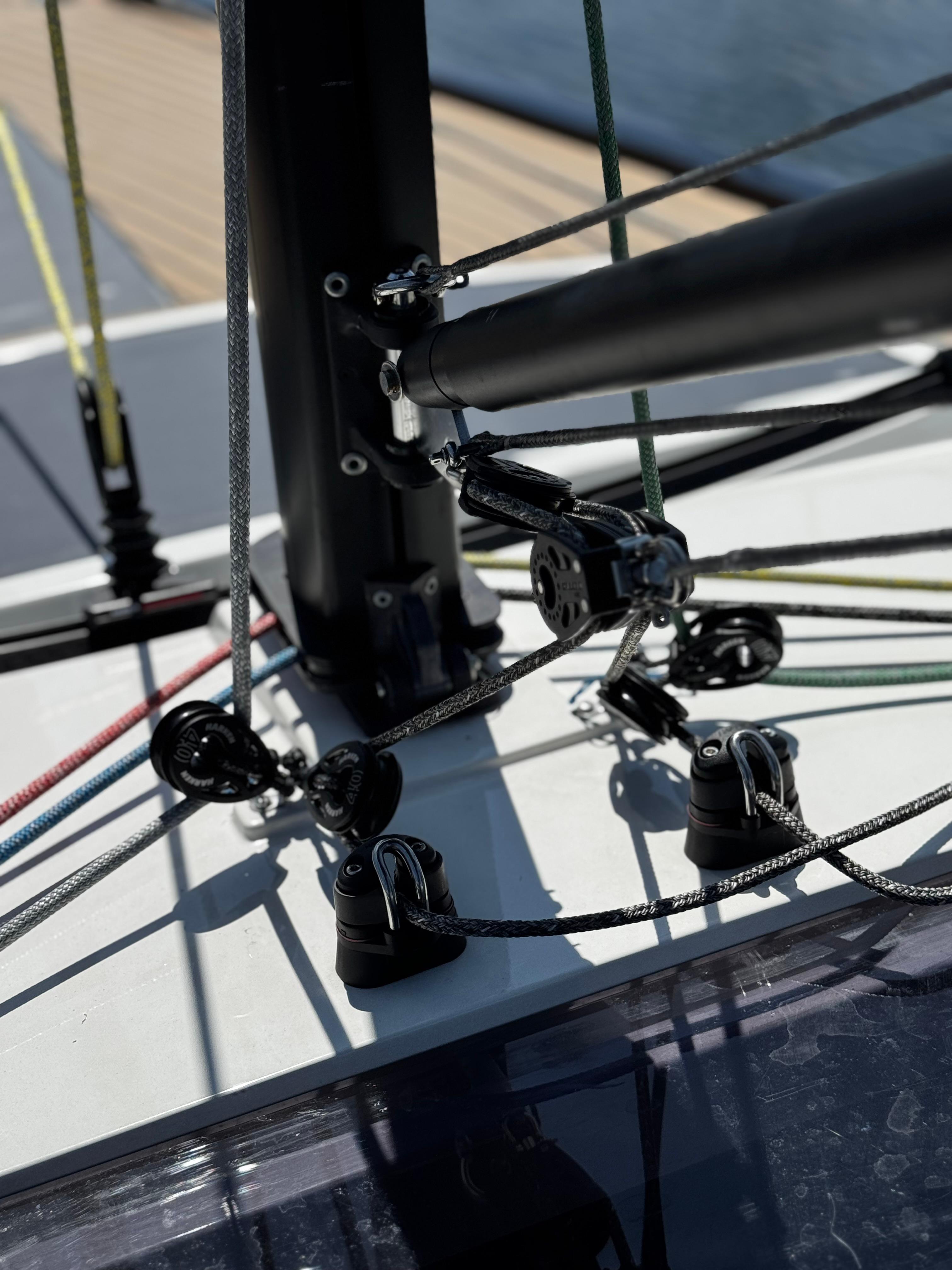 Black anodized aluminium bowsprit, 2x Harken self-tailing winch, all blocks and