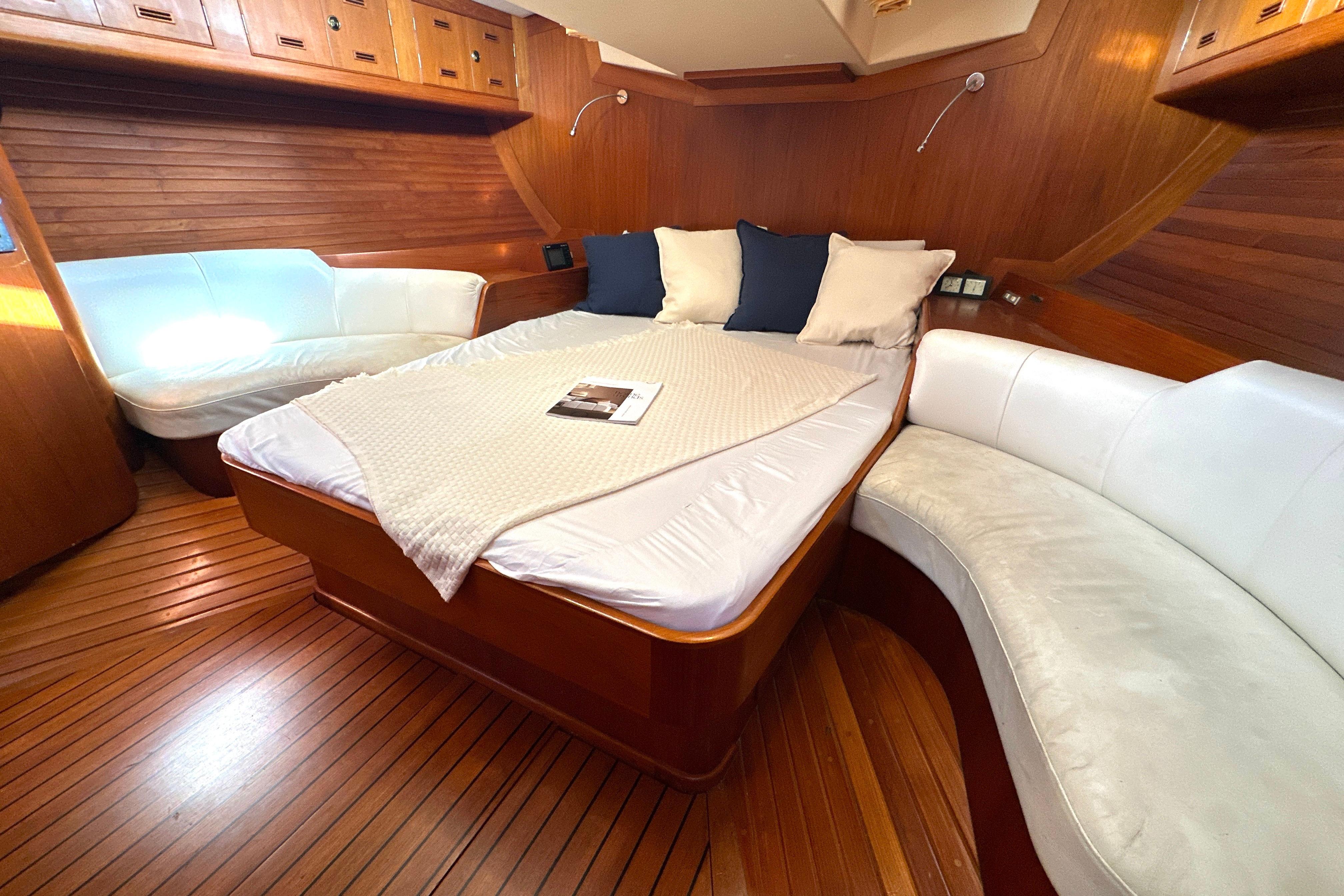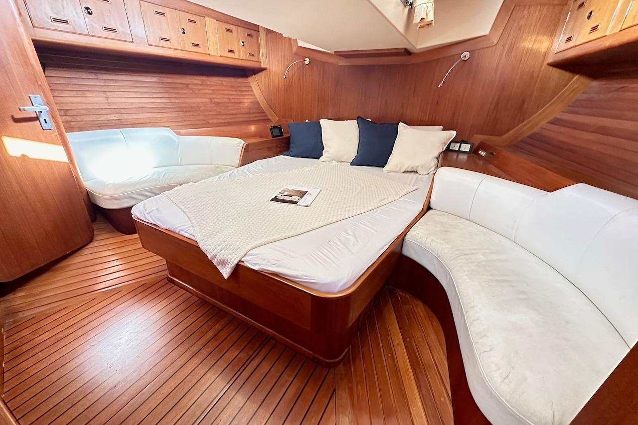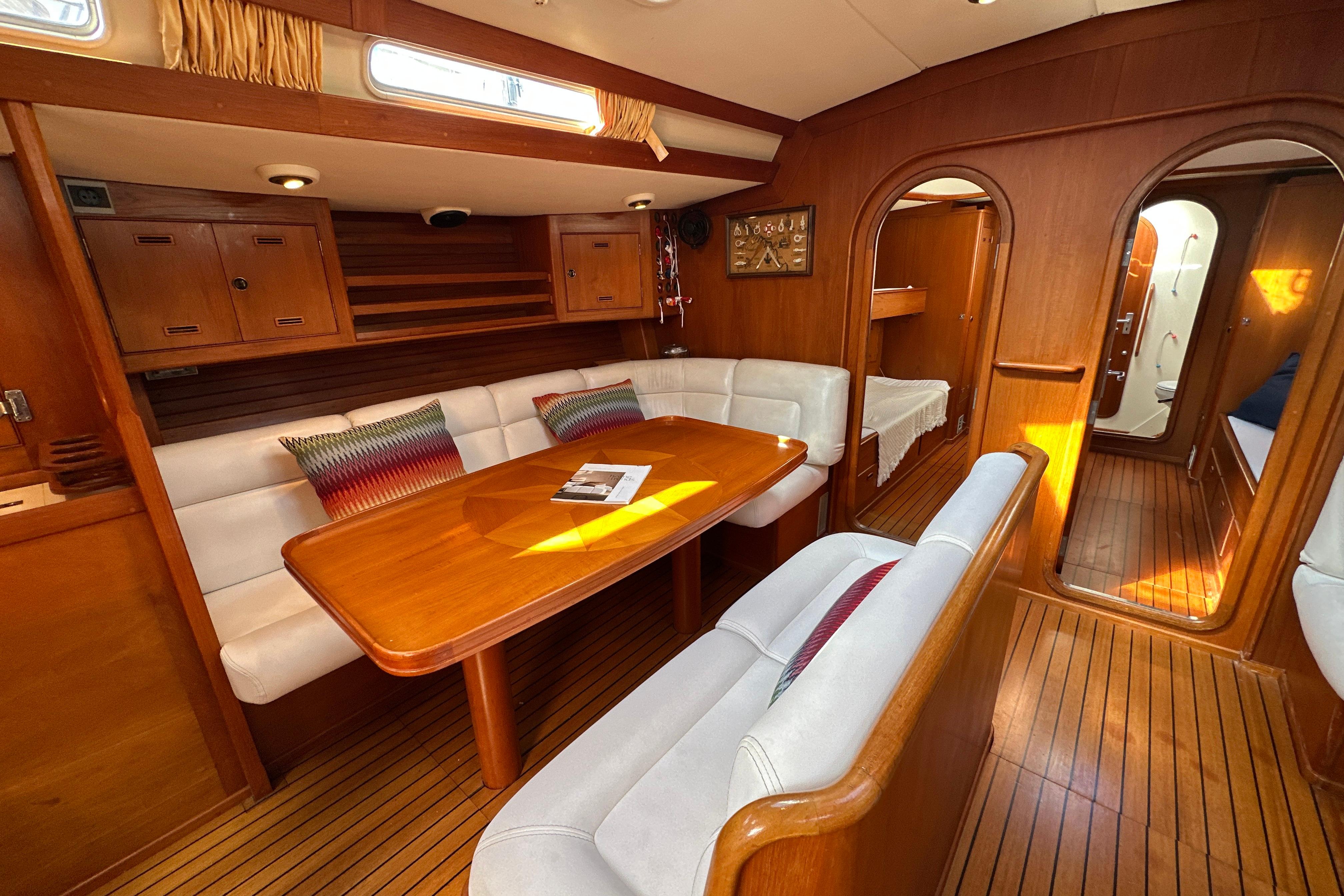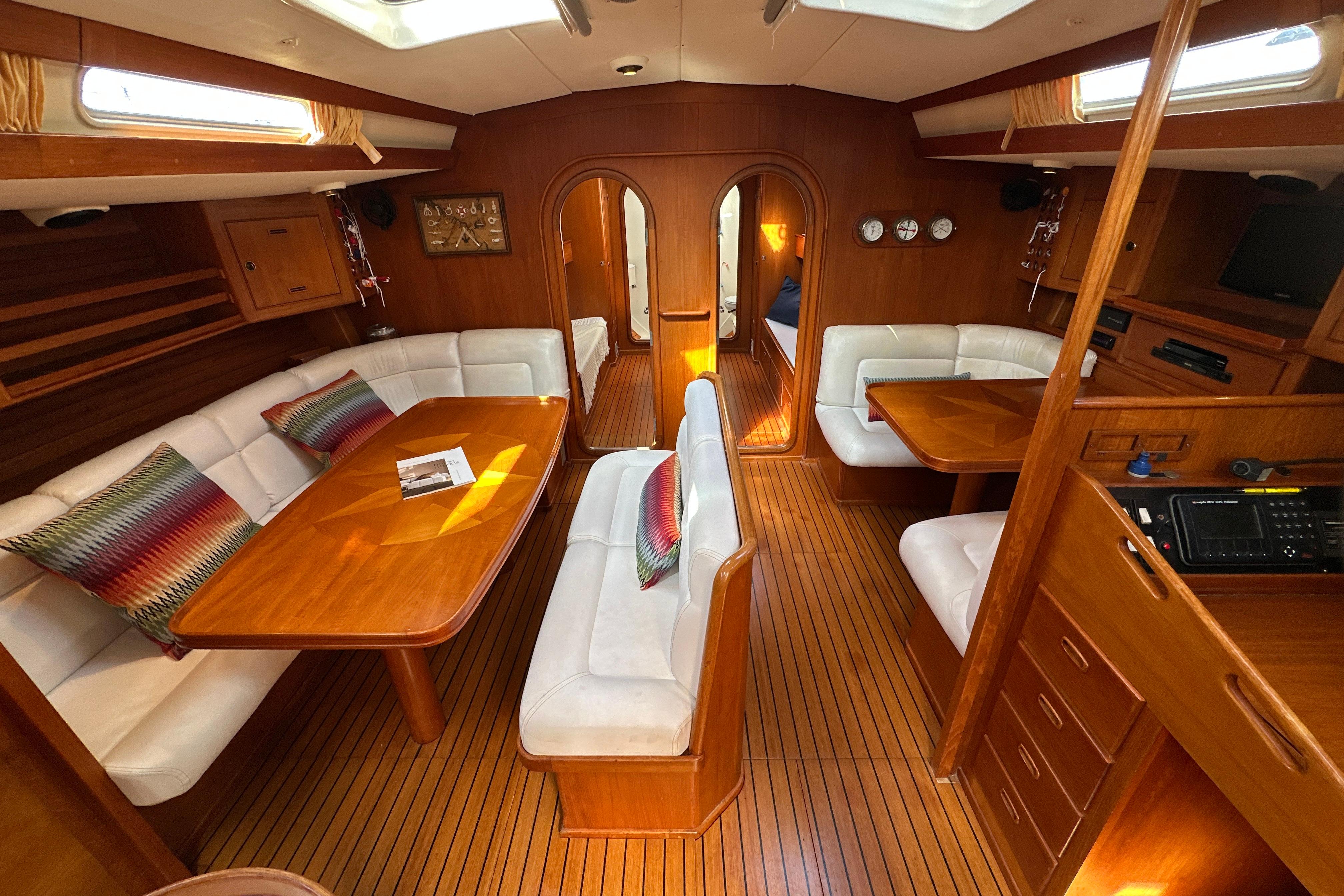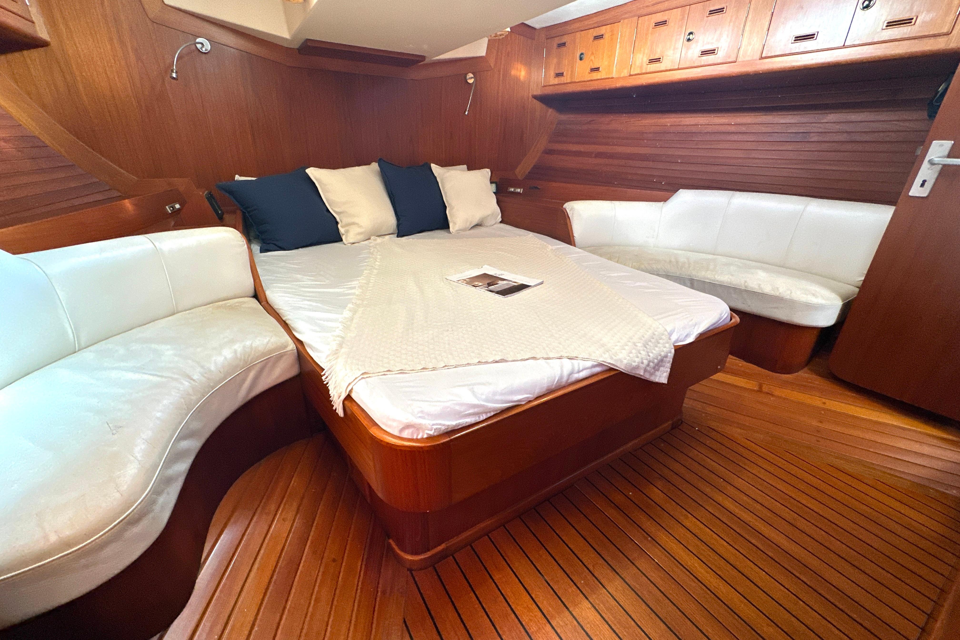 The interior offers a very spacious owner’s aft cabin with private head, including shower, toilet, and basin. The saloon features a large dining area to port and a cozy lounge corner to starboard. Forward, there is a V-berth cabin and two twin-bunk cabins on either side, connected to a generous head.