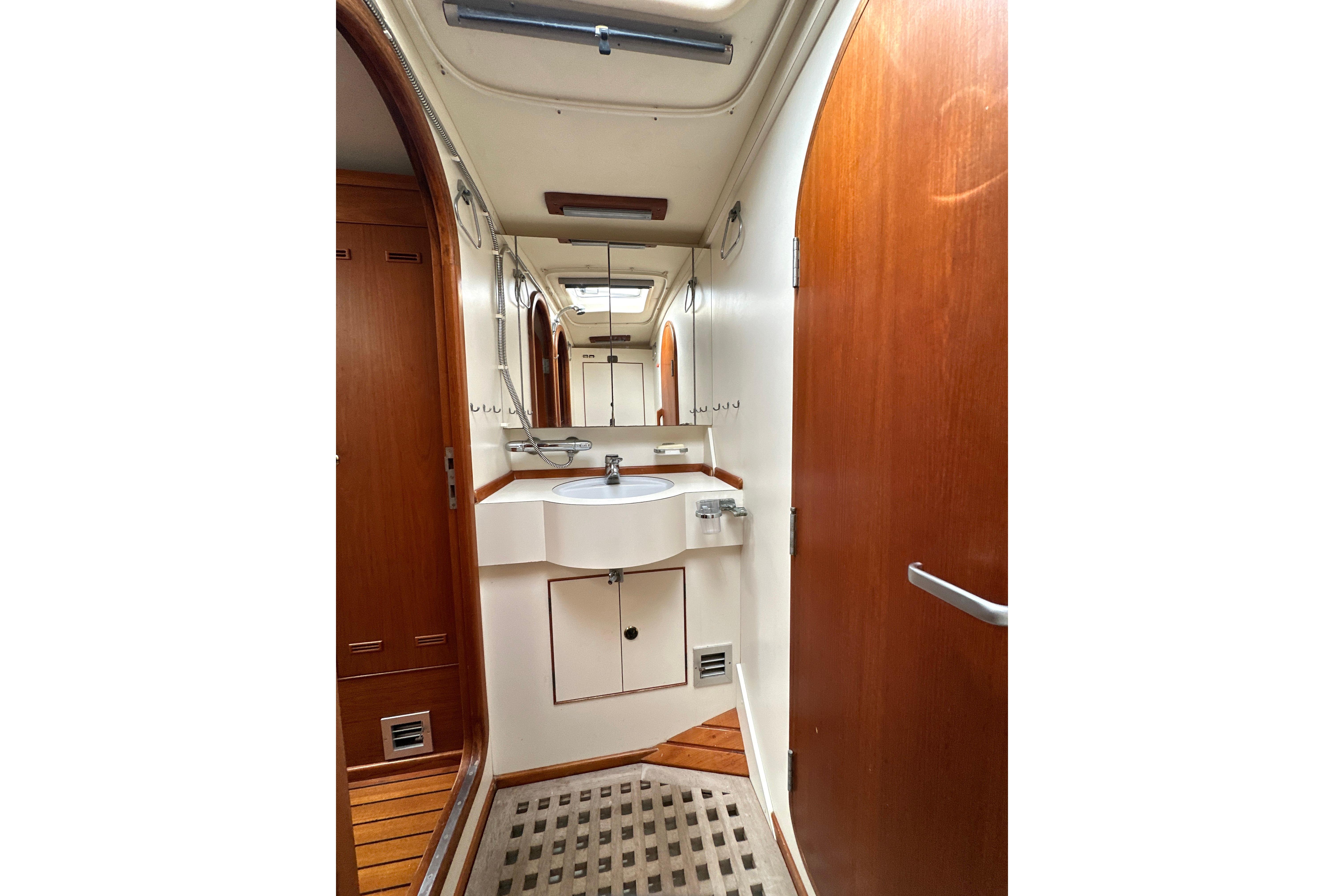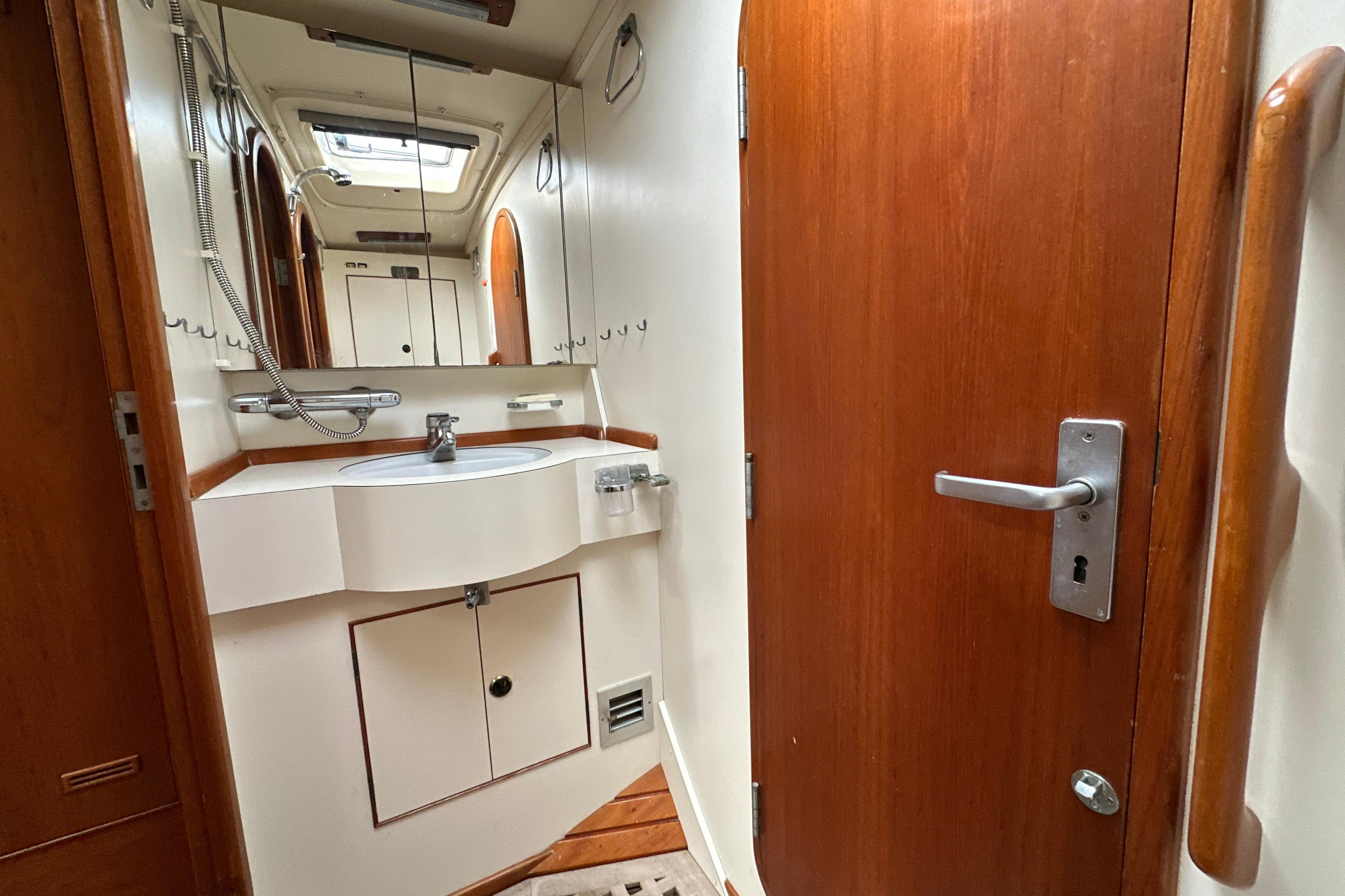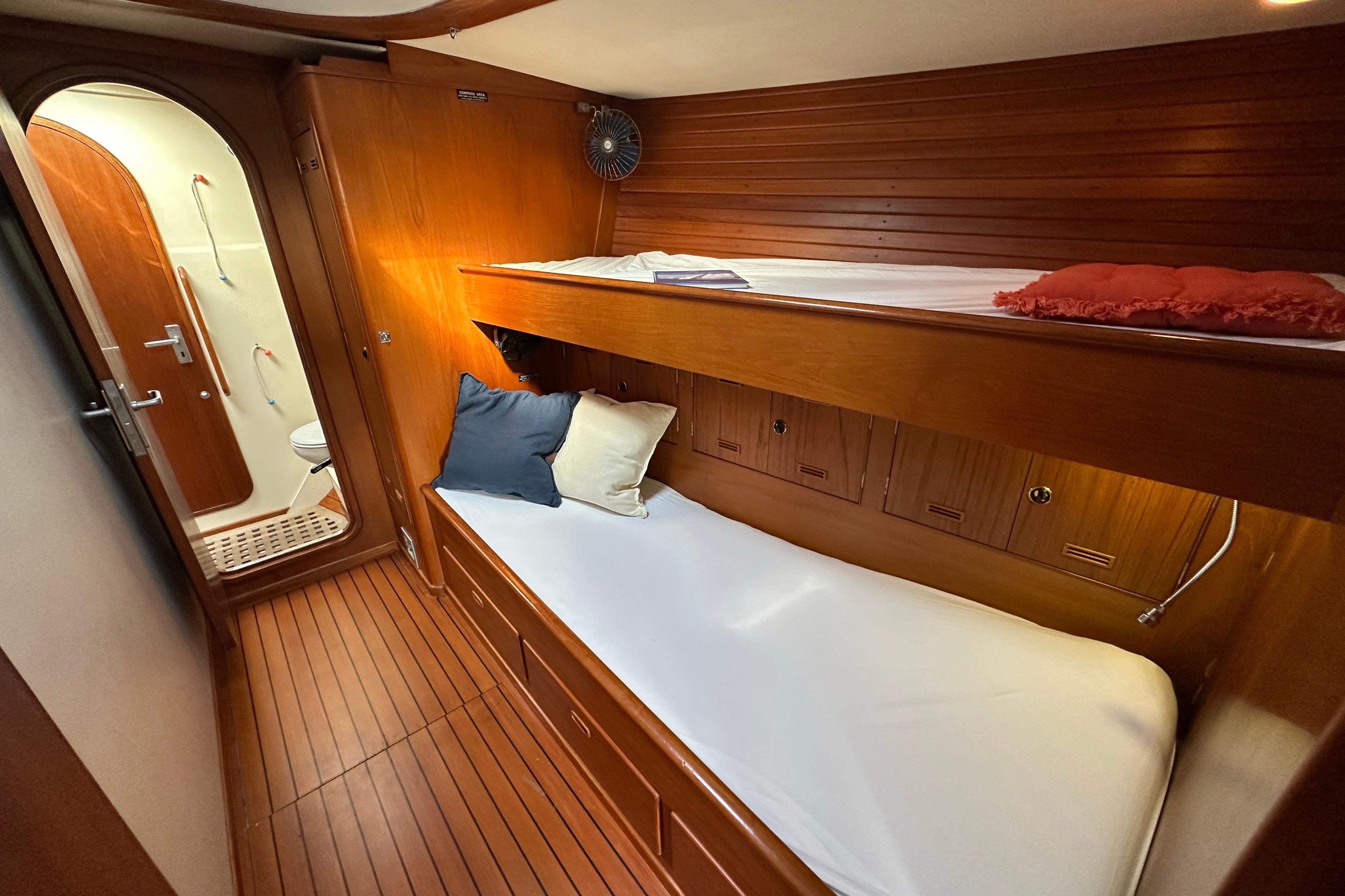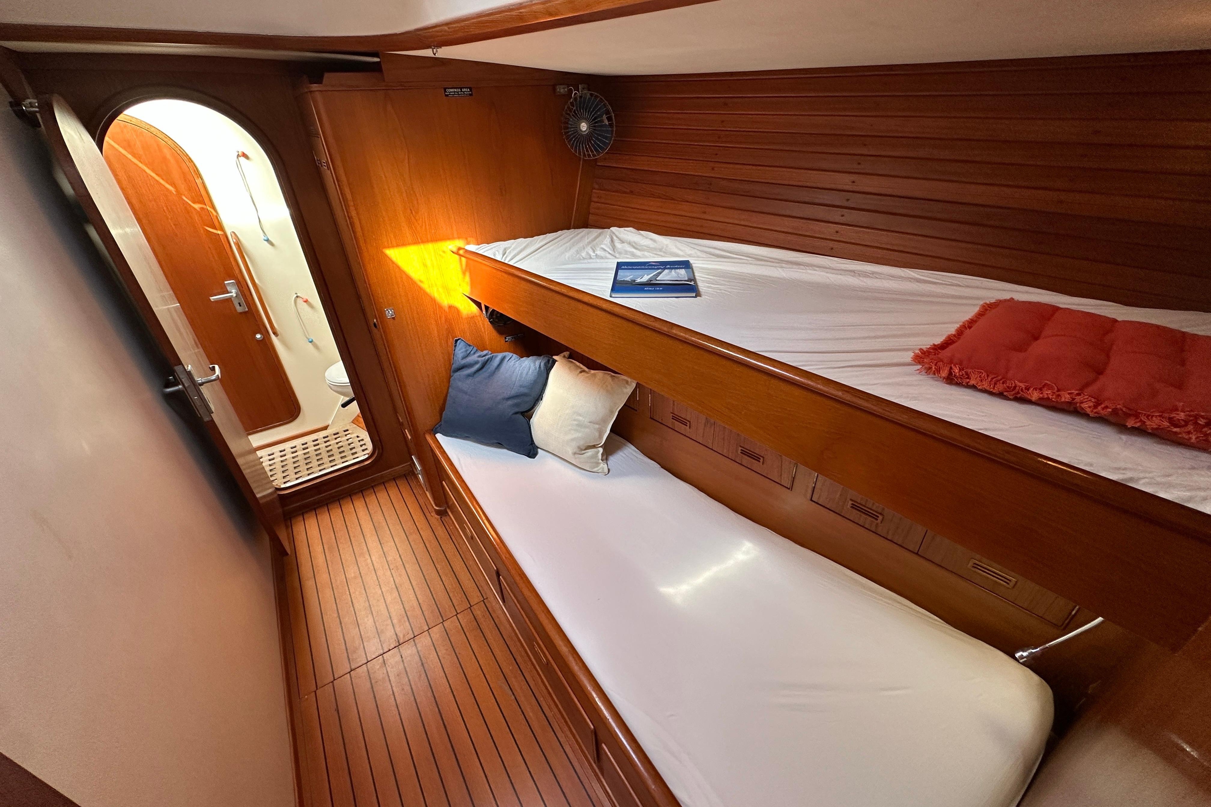 The interior offers a very spacious owner’s aft cabin with private head, including shower, toilet, and basin. The saloon features a large dining area to port and a cozy lounge corner to starboard. Forward, there is a V-berth cabin and two twin-bunk cabins on either side, connected to a generous head.
