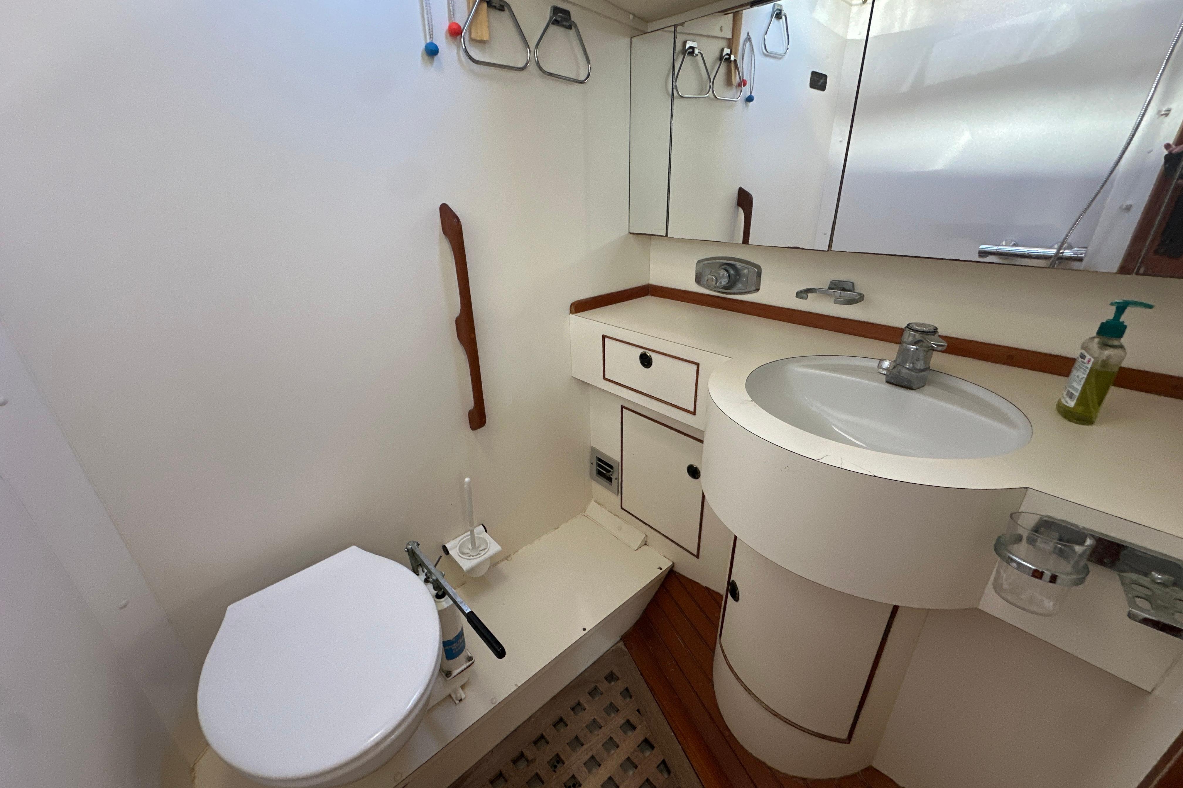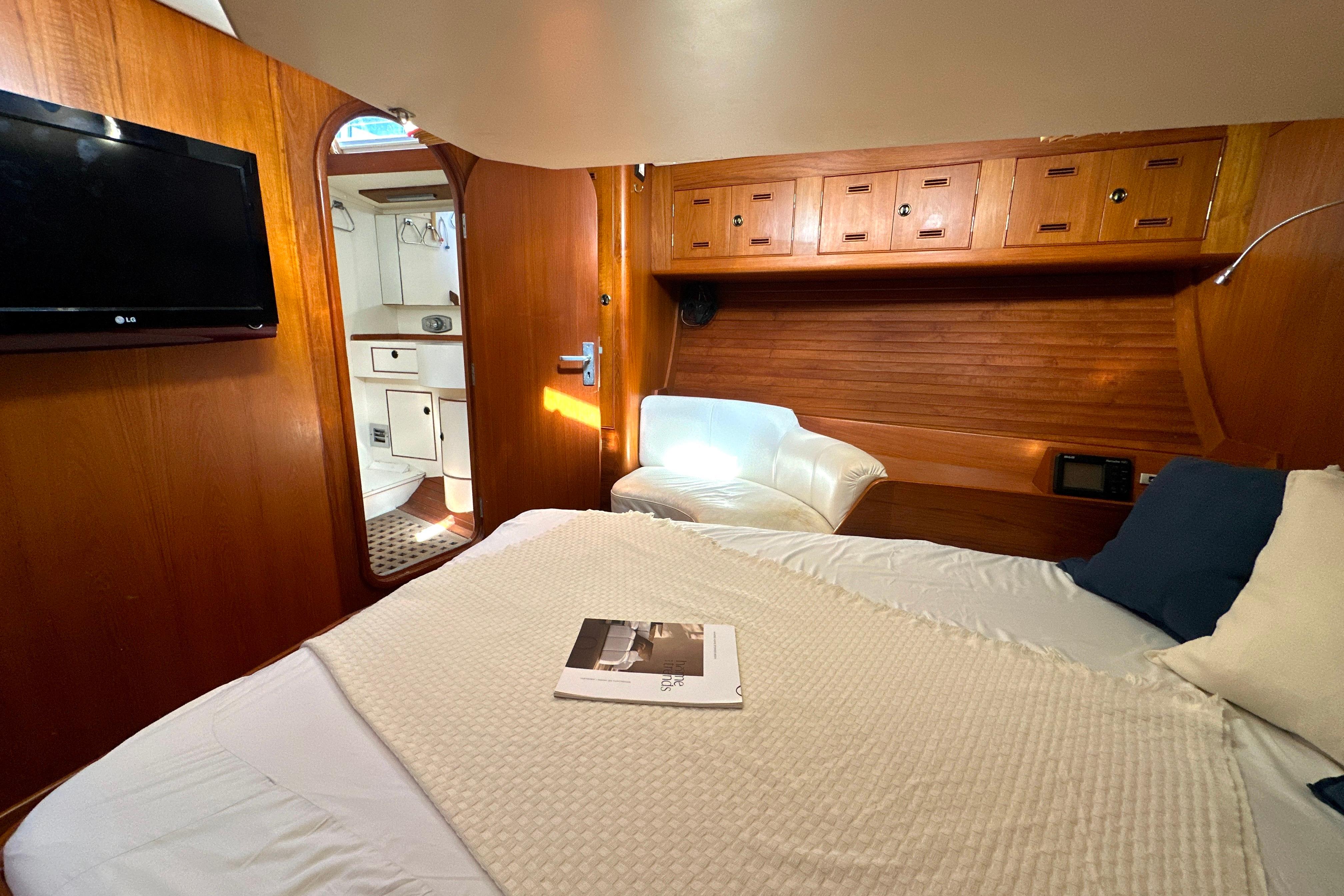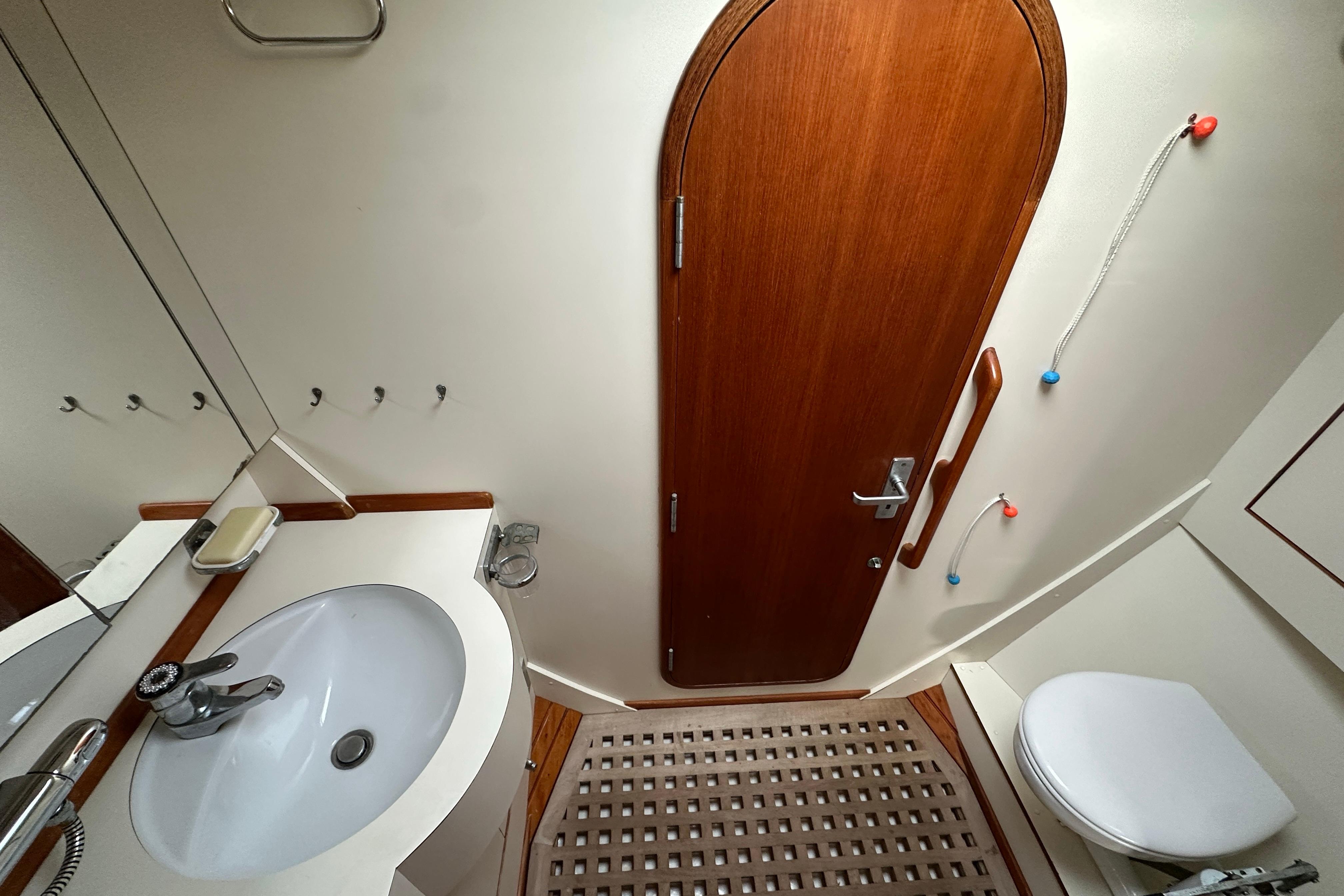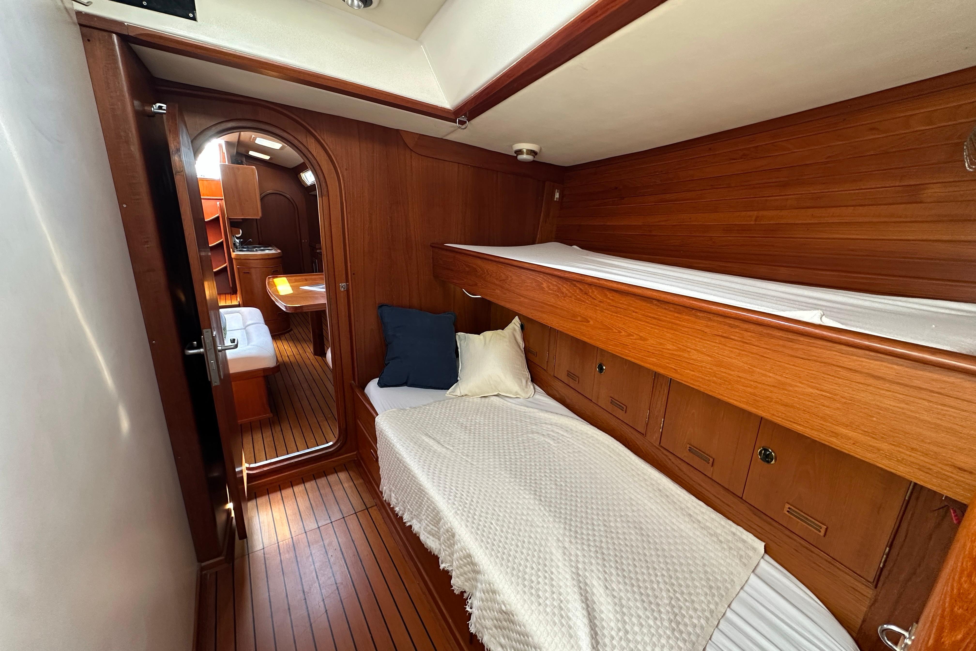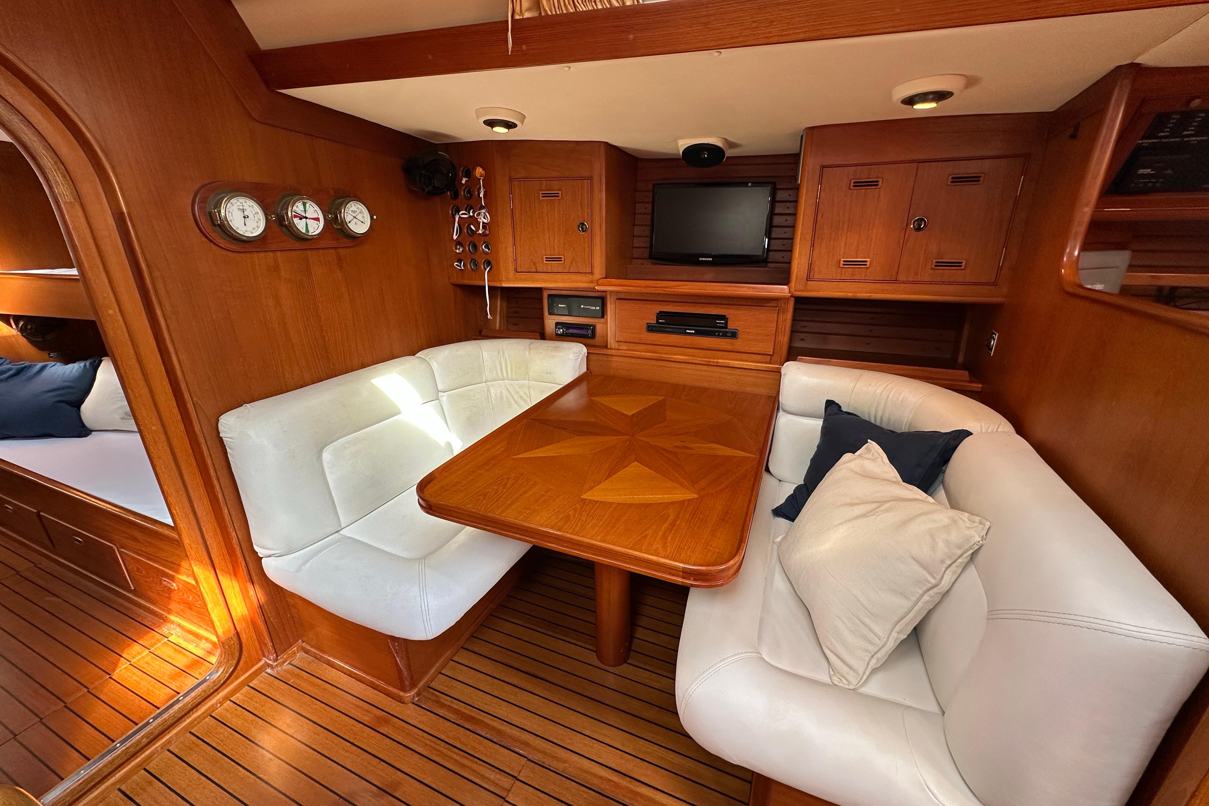 The interior offers a very spacious owner’s aft cabin with private head, including shower, toilet, and basin. The saloon features a large dining area to port and a cozy lounge corner to starboard. Forward, there is a V-berth cabin and two twin-bunk cabins on either side, connected to a generous head.